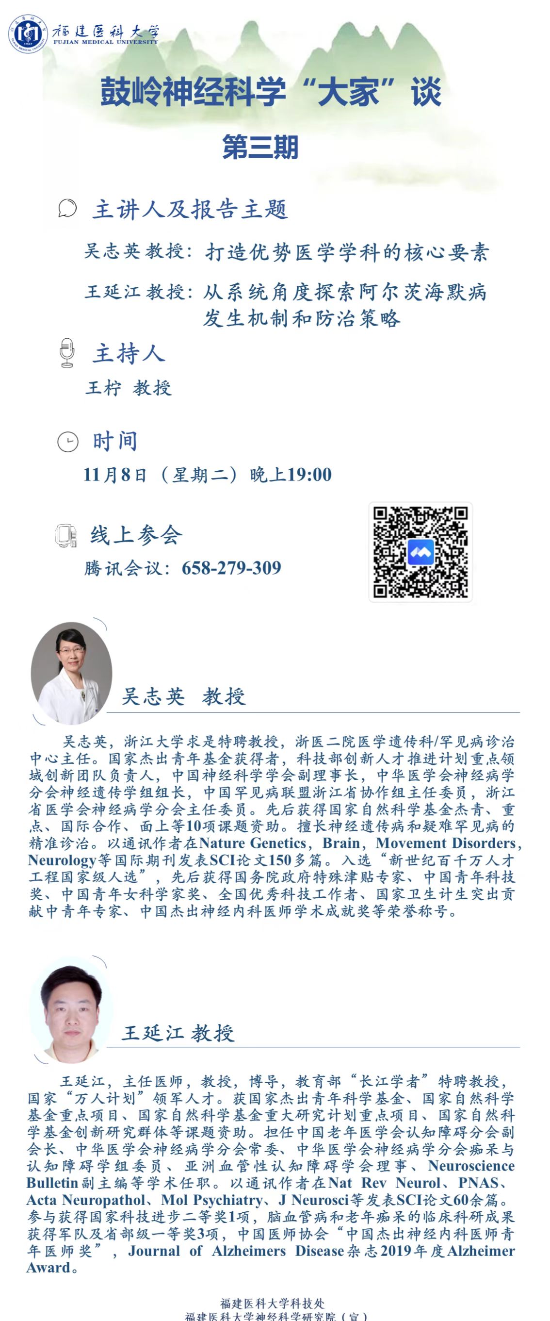 为了进一步提升我校的学术声誉和学科知名度,加强国际和国内同行间的交流与合作,同时以神经科学带动多学科协同发展,共同加快推进我校的“双一流”建设。我校采取“请进来”“走出去”相结合的模式,举办鼓岭神经科学“大家”谈系列学术讲座,定期邀请国内外知名专家以及本校学者开展高水平学术讲座。第三期我们邀请了浙江大学附属第二医院吴志英教授和第三军医大学大坪医院王延江教授于2022年11月8日举办讲座,欢迎大家积极参会!