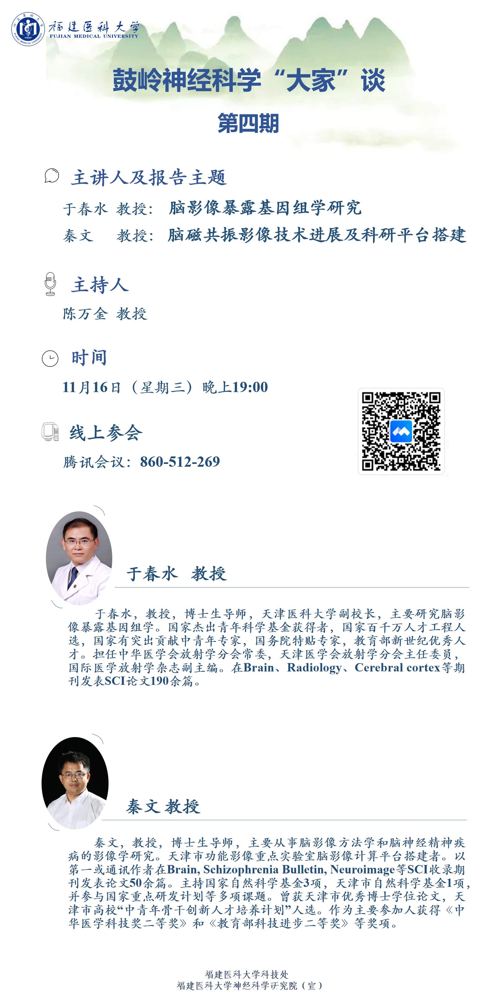 为了进一步提升我校的学术声誉和学科知名度,加强国际和国内同行间的交流与合作,同时以神经科学带动多学科协同发展,共同加快推进我校的“双一流”建设。我校采取“请进来”“走出去”相结合的模式,举办鼓岭神经科学“大家”谈系列学术讲座,定期邀请国内外知名专家以及本校学者开展高水平学术讲座。第四期我们邀请了天津医科大学于春水教授和天津医科大学总医院秦文教授于2022年11月16日举办讲座,欢迎大家积极参会!