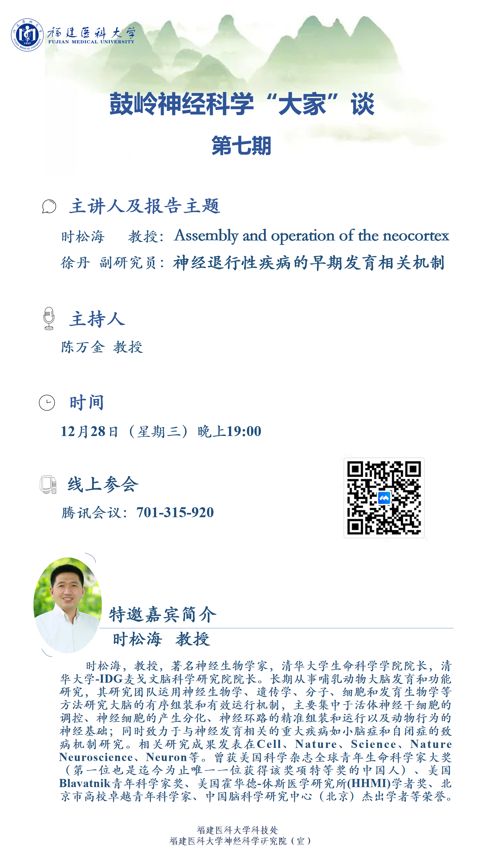 为了进一步提升我校的学术声誉和学科知名度,加强国际和国内同行间的交流与合作,同时以神经科学带动多学科协同发展,共同加快推进我校的“双一流”建设。我校采取“请进来”“走出去”相结合的模式,举办鼓岭神经科学“大家”谈系列学术讲座,定期邀请国内外知名专家以及本校学者开展高水平学术讲座。第七期我们邀请了清华大学时松海教授和福建医科大学徐丹副研究员于20221228日举办讲座,欢迎大家积极参会!