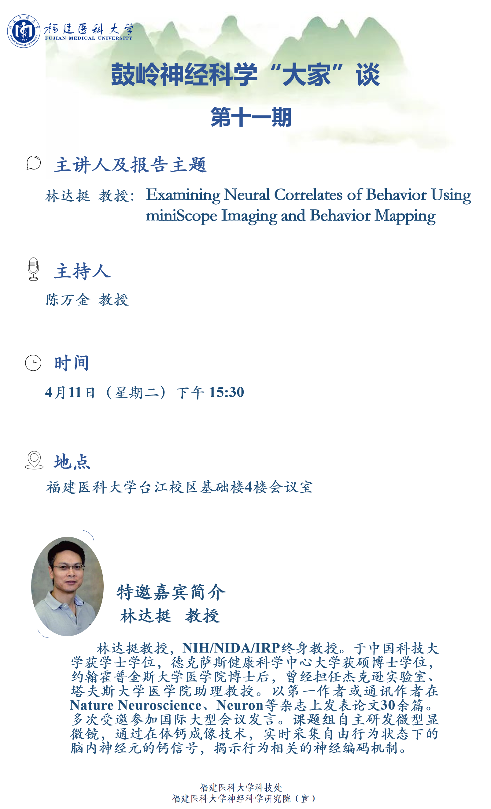 为了进一步提升我校的学术声誉和学科知名度,加强国际和国内同行间的交流与合作,同时以神经科学带动多学科协同发展,共同加快推进我校的“双一流”建设。我校采取“请进来”“走出去”相结合的模式,举办鼓岭神经科学“大家”谈系列学术讲座,定期邀请国内外知名专家以及本校学者开展高水平学术讲座。第十一期我们邀请了NIH/NIDA/IRP终身教授林达挺教授于2023年4月11日举办讲座,欢迎大家积极参会!