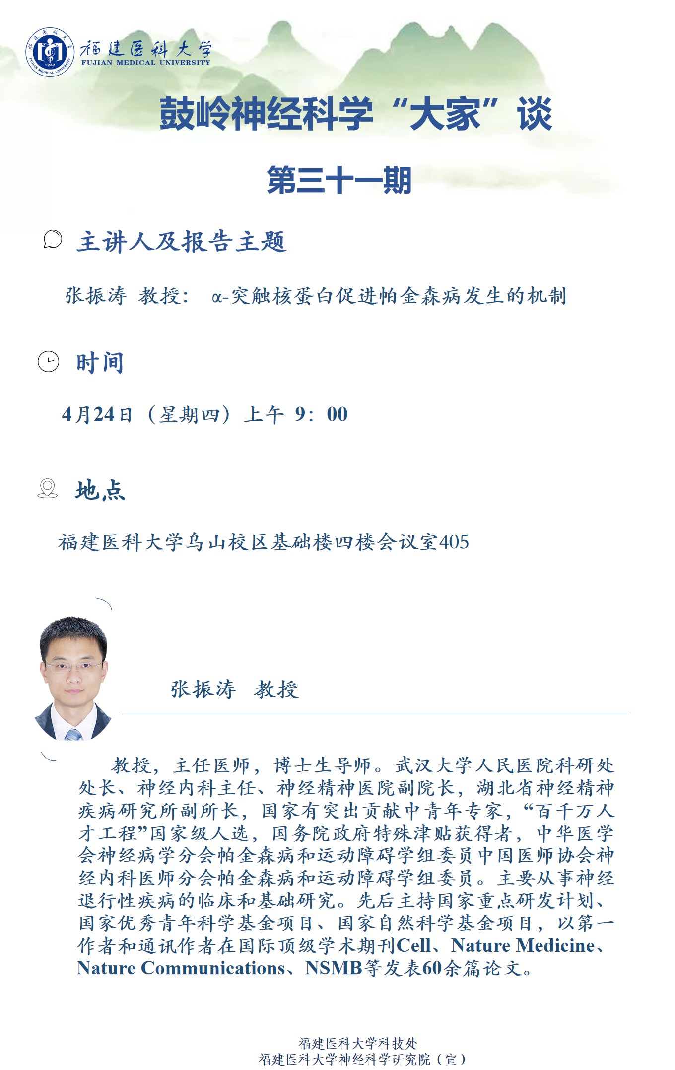 张振涛,教授,主任医师,博士生导师。武汉大学人民医院科研处处长、神经内科主任、神经精神医院副院长,湖北省神经精神疾病研究所副所长,国家有突出贡献中青年专家,“百千万人才工程”国家级人选,国务院政府特殊津贴获得者,中华医学会神经病学分会帕金森病和运动障碍学组委员中国医师协会神经内科医师分会帕金森病和运动障碍学组委员。主要从事神经退行性疾病的临床和基础研究。先后主持国家重点研发计划、国家优秀青年科学基金项目、国家自然科学基金项目,以第一作者和通讯作者在国际顶级学术期刊Cell、Nature Medicine、Nature Communications、NSMB等发表60余篇论文。