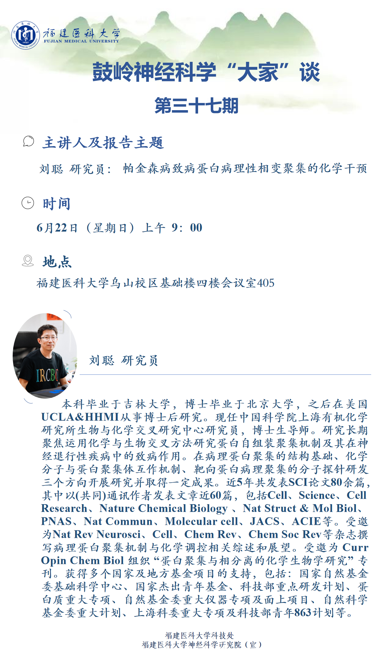 讲座主题:帕金森病致病蛋白病理性相变聚集的化学干预