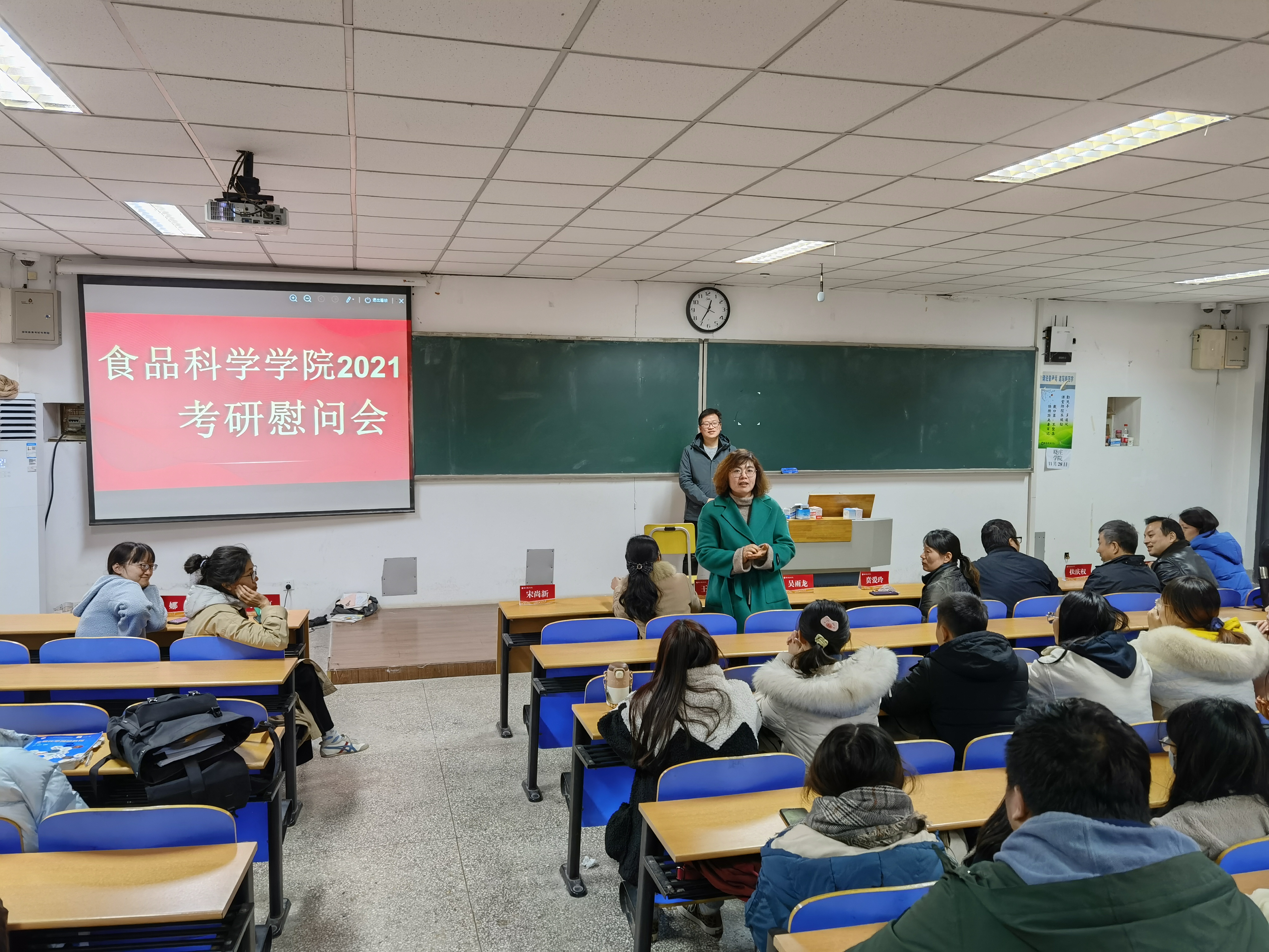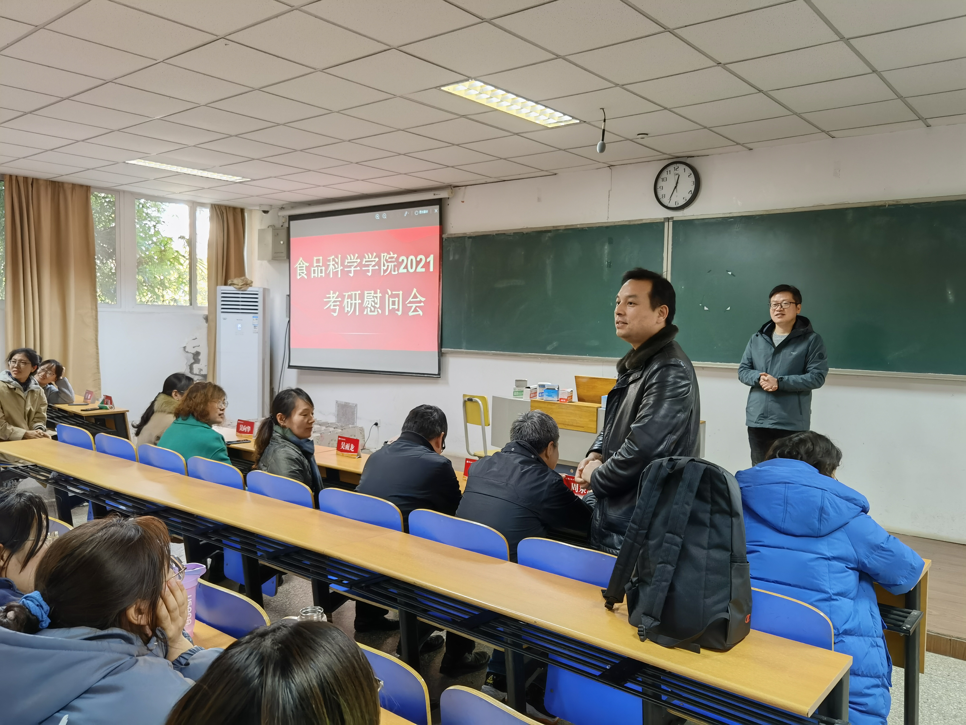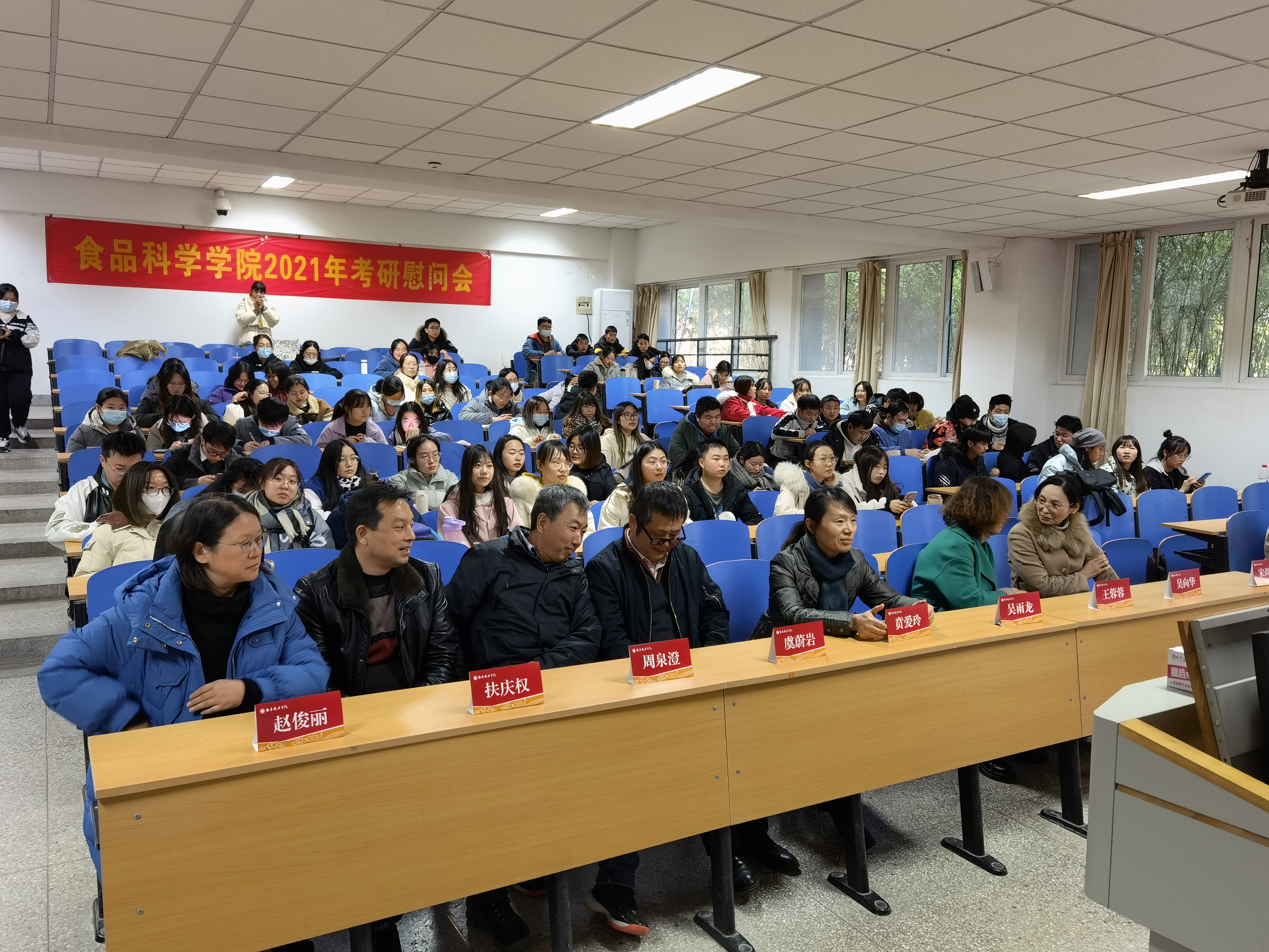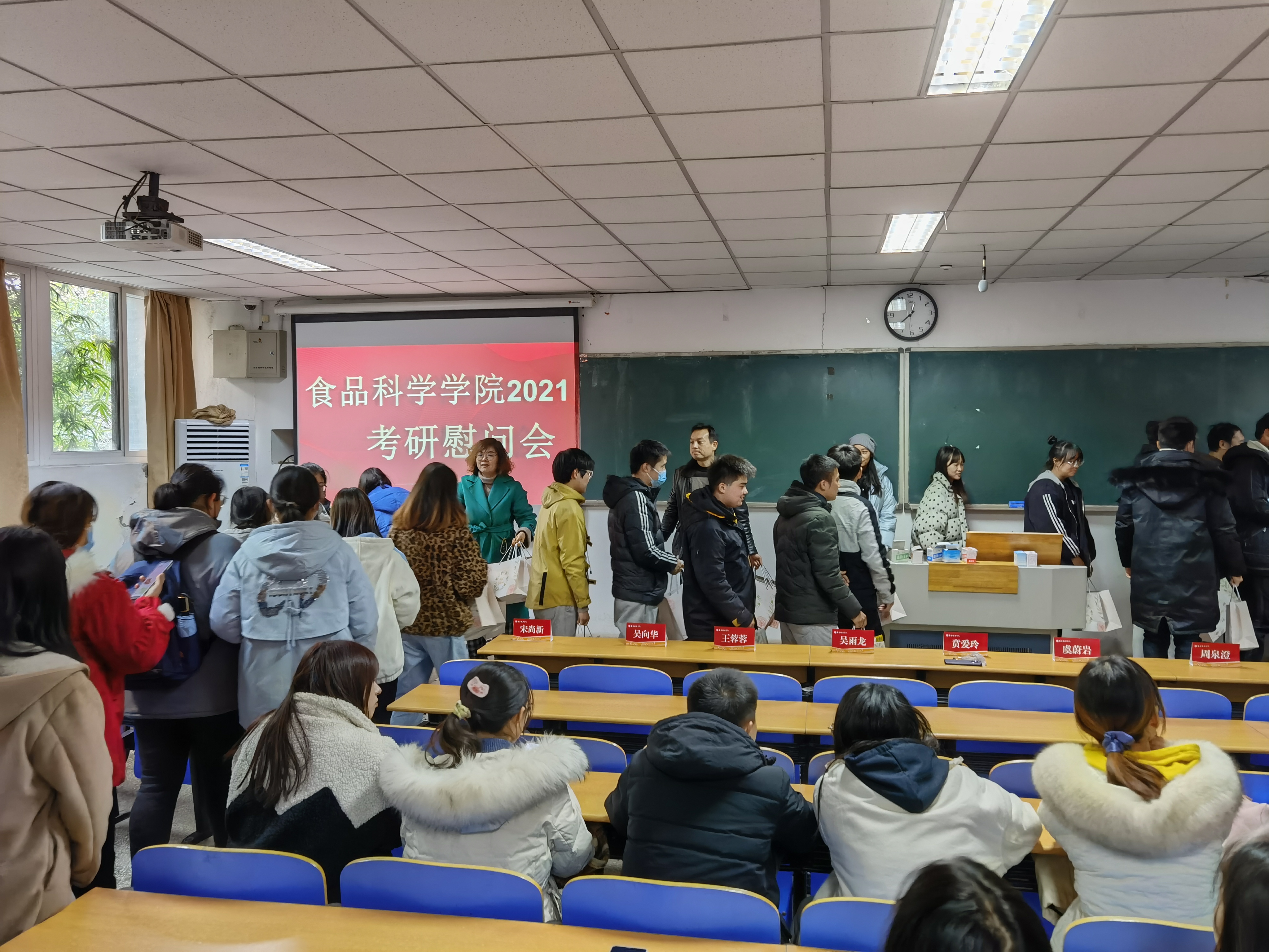 全国硕士研究生入学考试在即,为鼓舞考研学子信心,帮助考研学子缓解备考压力,坚定考研信心,积极冲刺迎考,12月2日,食品科学学院在行知组团E104举办2021年考研慰问会,学院党政领导、关工委老同志、毕业班班主任、考研同学代表参加慰问会。