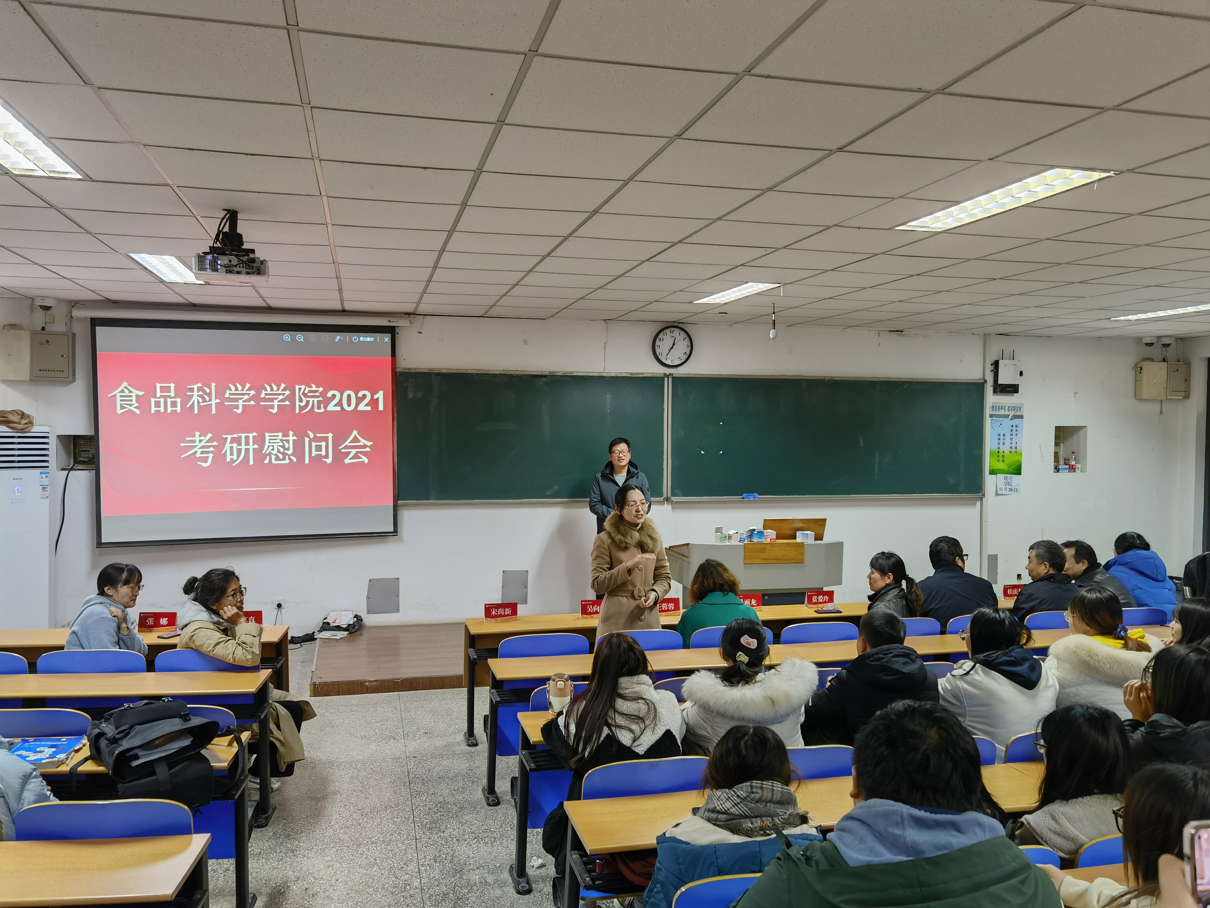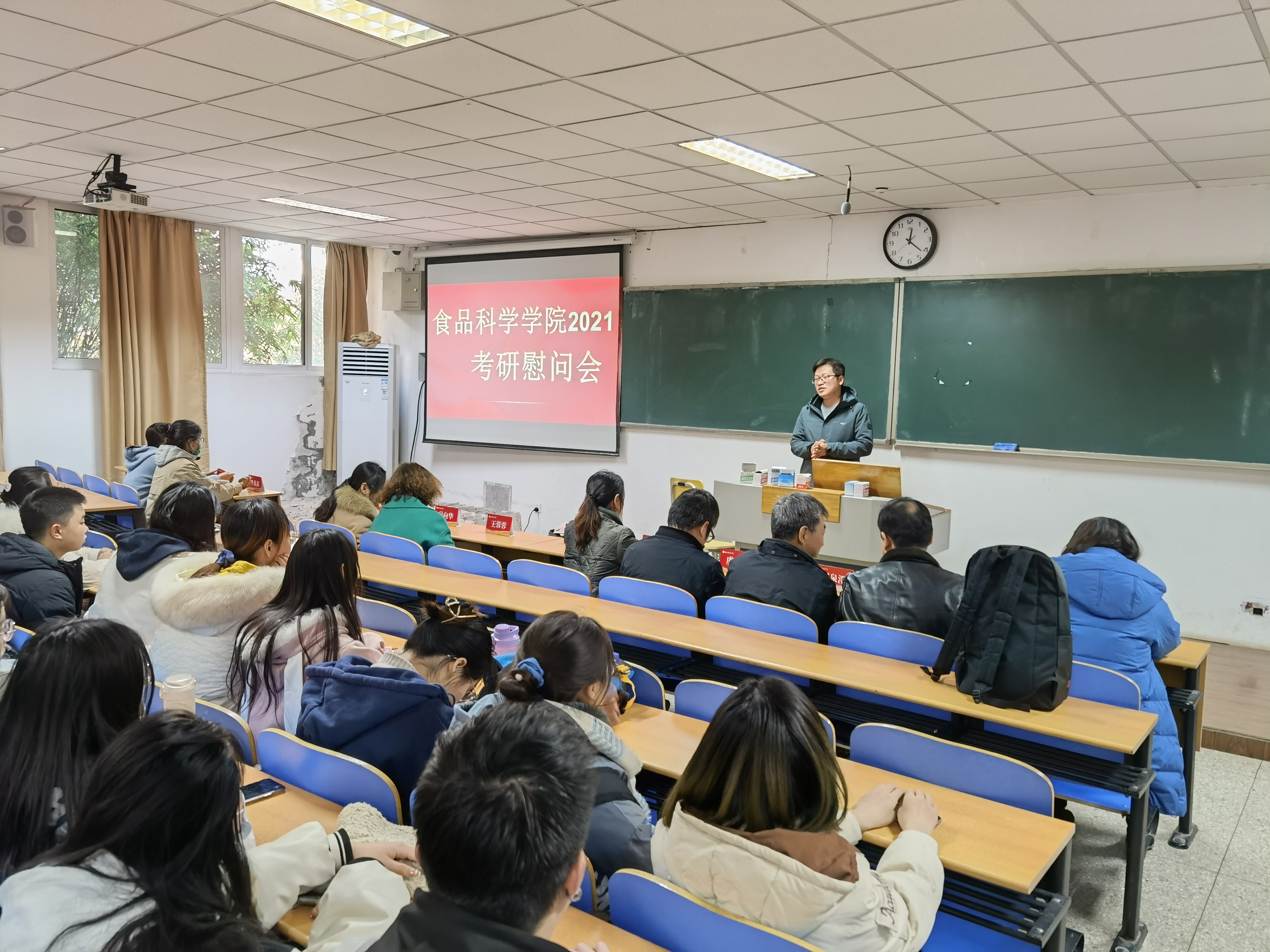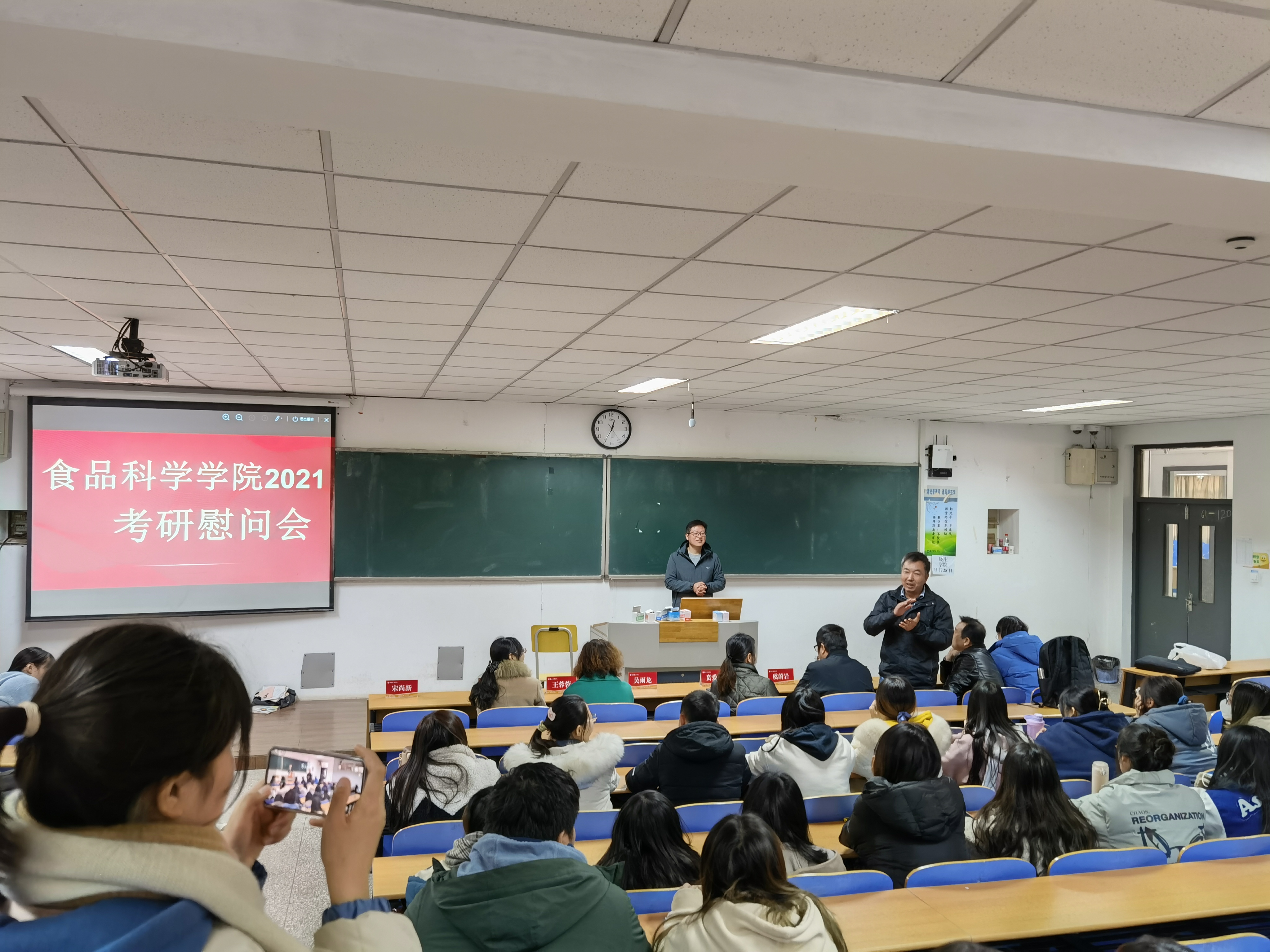 全国硕士研究生入学考试在即,为鼓舞考研学子信心,帮助考研学子缓解备考压力,坚定考研信心,积极冲刺迎考,12月2日,食品科学学院在行知组团E104举办2021年考研慰问会,学院党政领导、关工委老同志、毕业班班主任、考研同学代表参加慰问会。