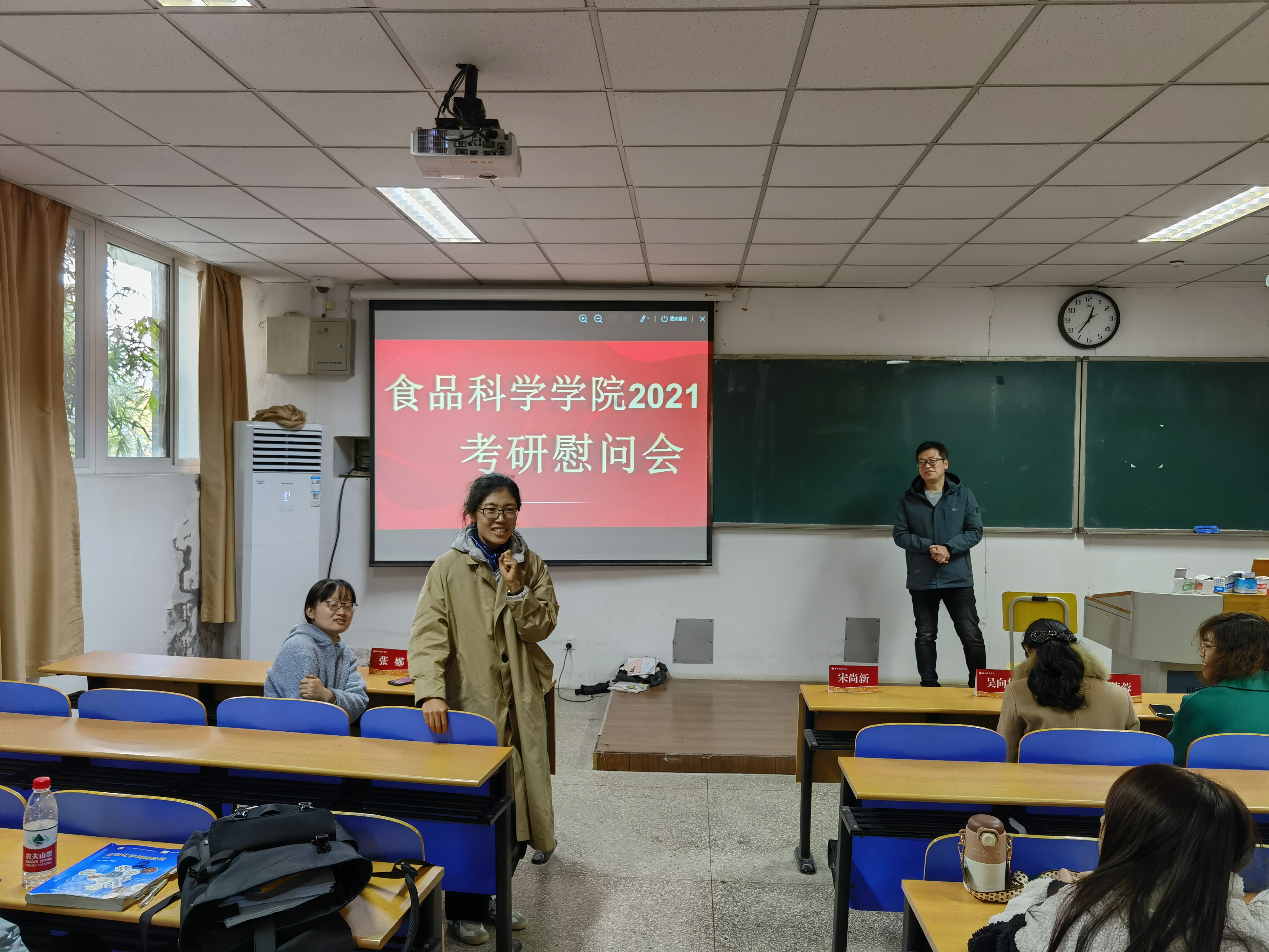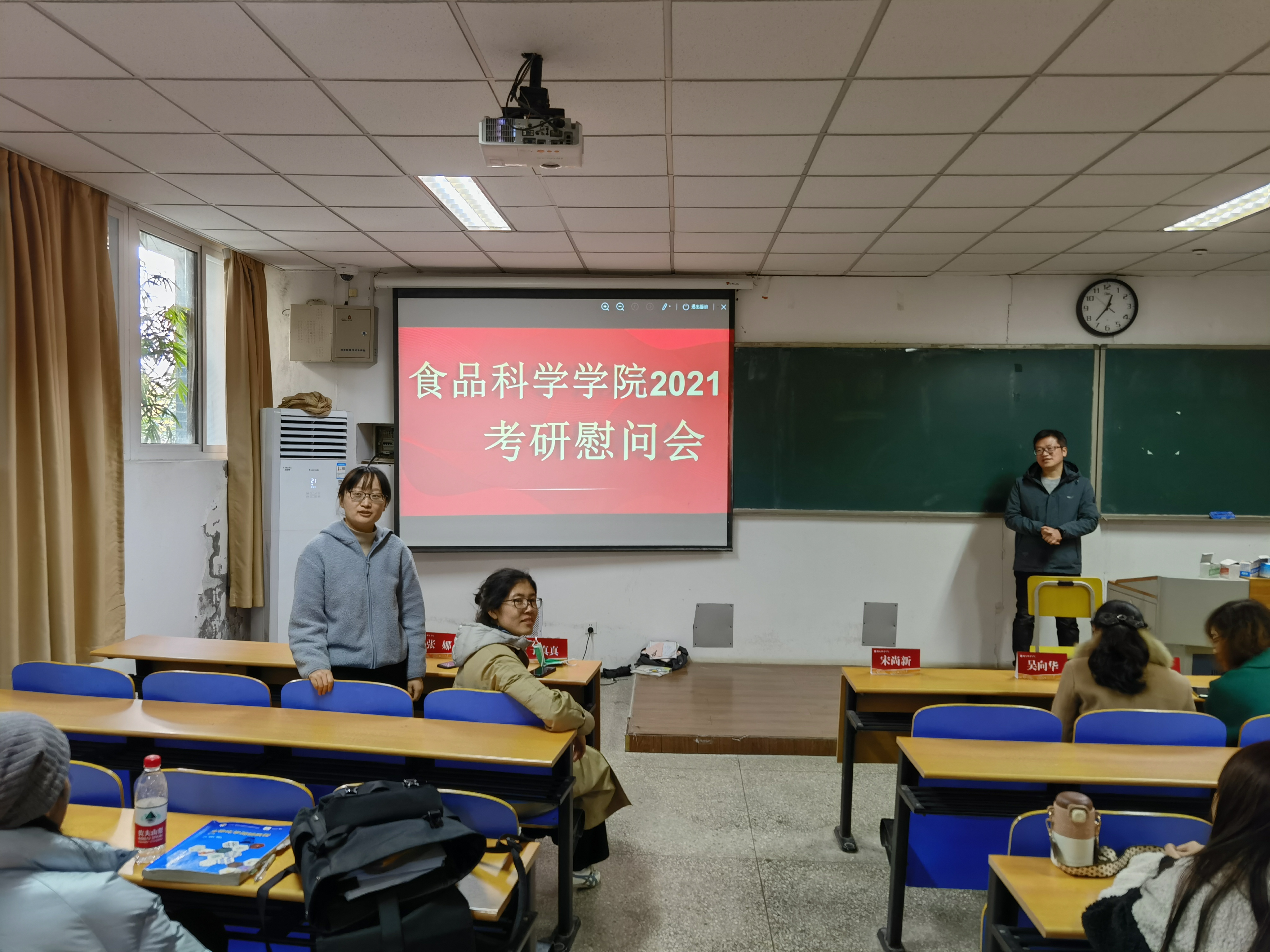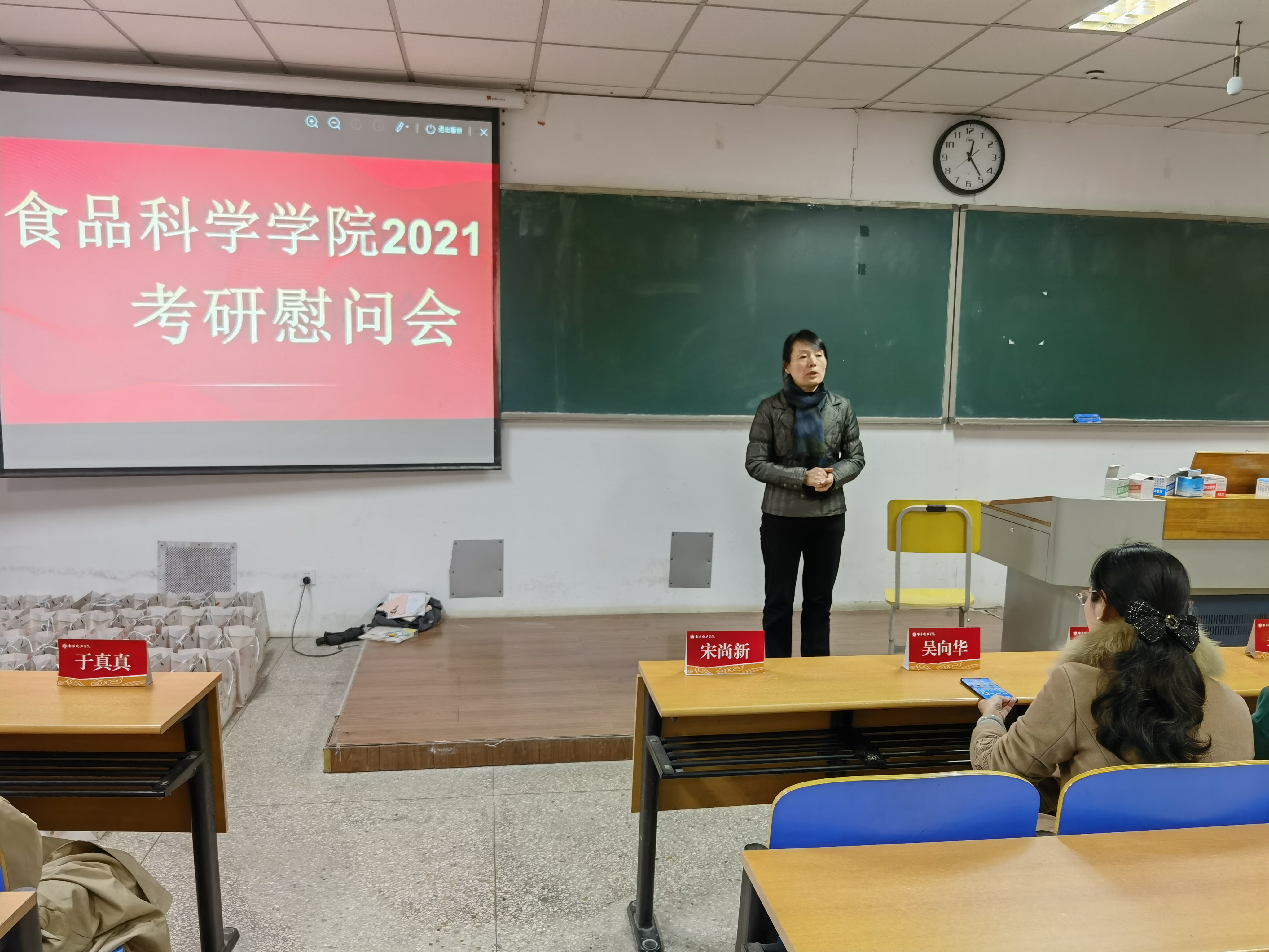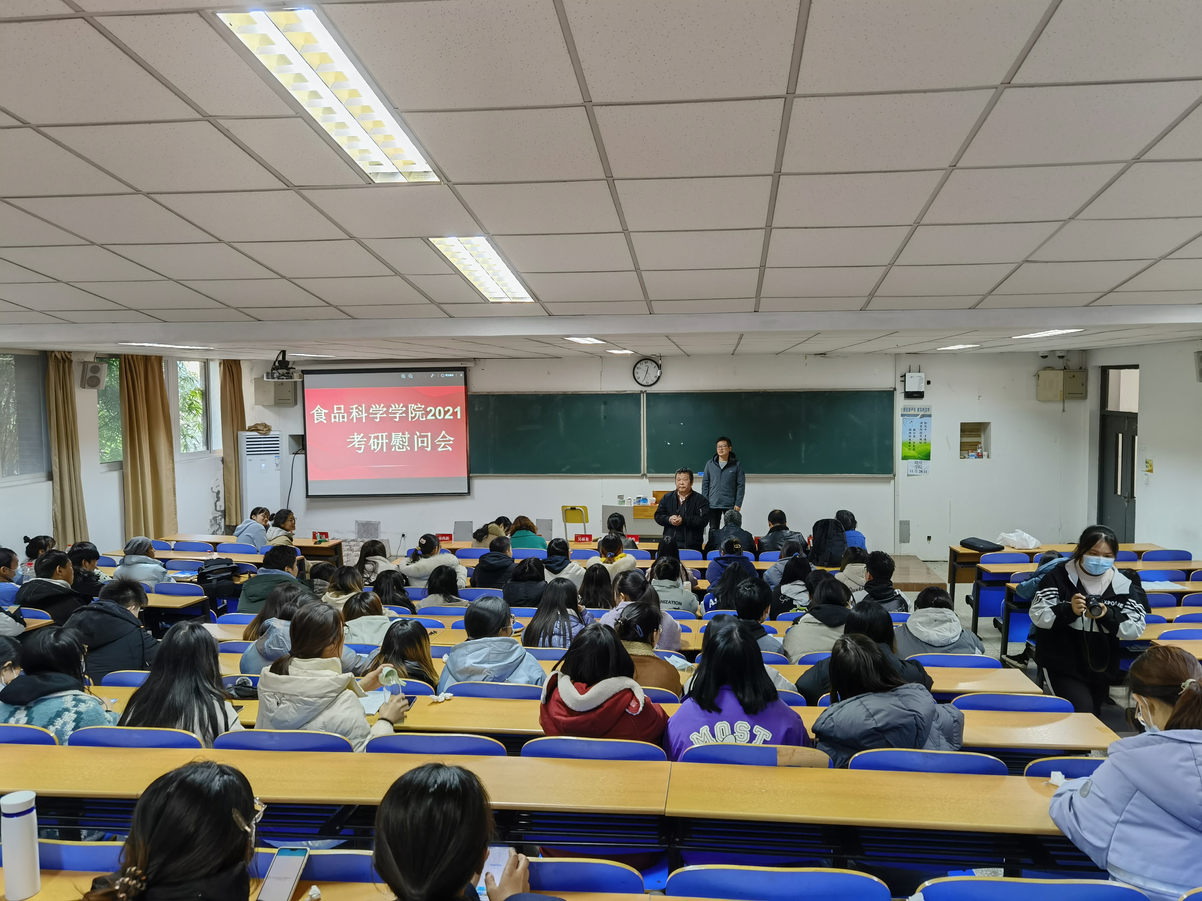 全国硕士研究生入学考试在即,为鼓舞考研学子信心,帮助考研学子缓解备考压力,坚定考研信心,积极冲刺迎考,12月2日,食品科学学院在行知组团E104举办2021年考研慰问会,学院党政领导、关工委老同志、毕业班班主任、考研同学代表参加慰问会。