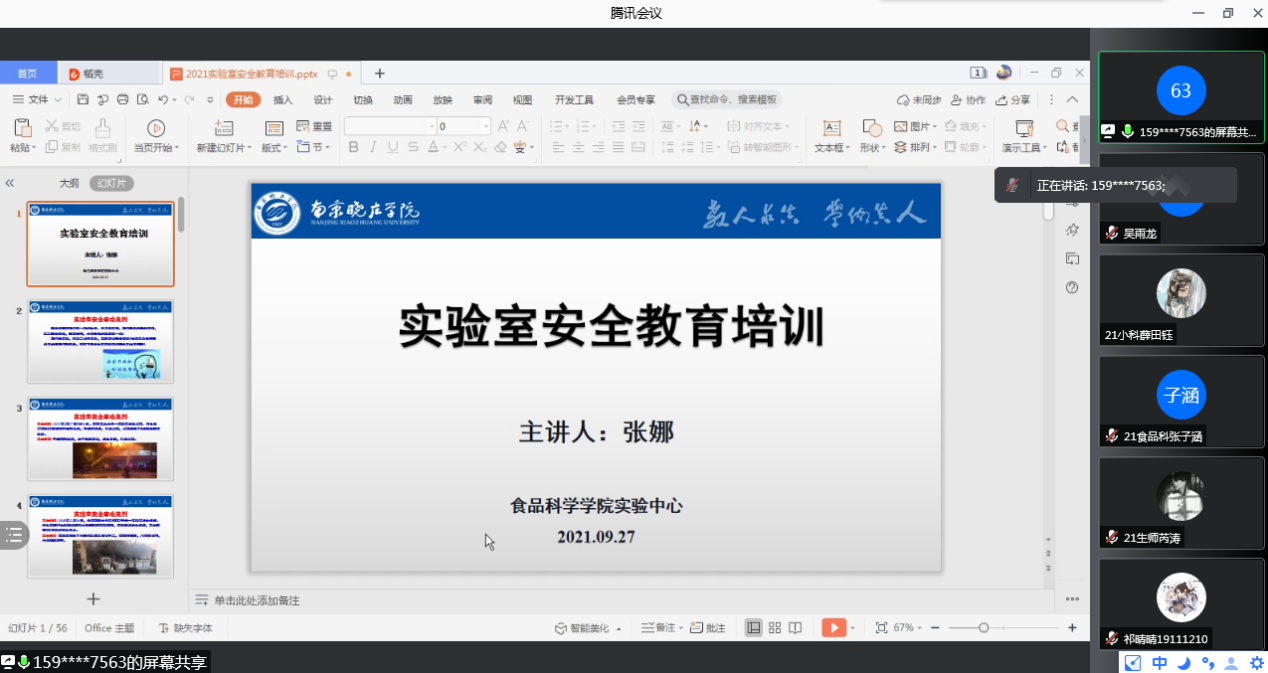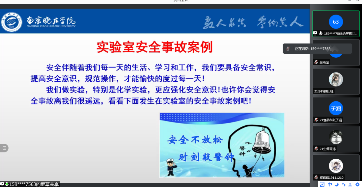 为落实江苏省教育厅和南京市教育局有关实验室安全管理的要求,进一步提升我院实验室安全管理水平,提高新生实验室安全意识,预防和遏制实验室事故发生。 9月27日下午,食品科学学院实验中心通过线上教学平台,组织开展了21级新生实验室安全知识培训会,由学院实验中心副主任张娜老师作了《做好实验室安全管理,防范实验室安全事故》的培训。
