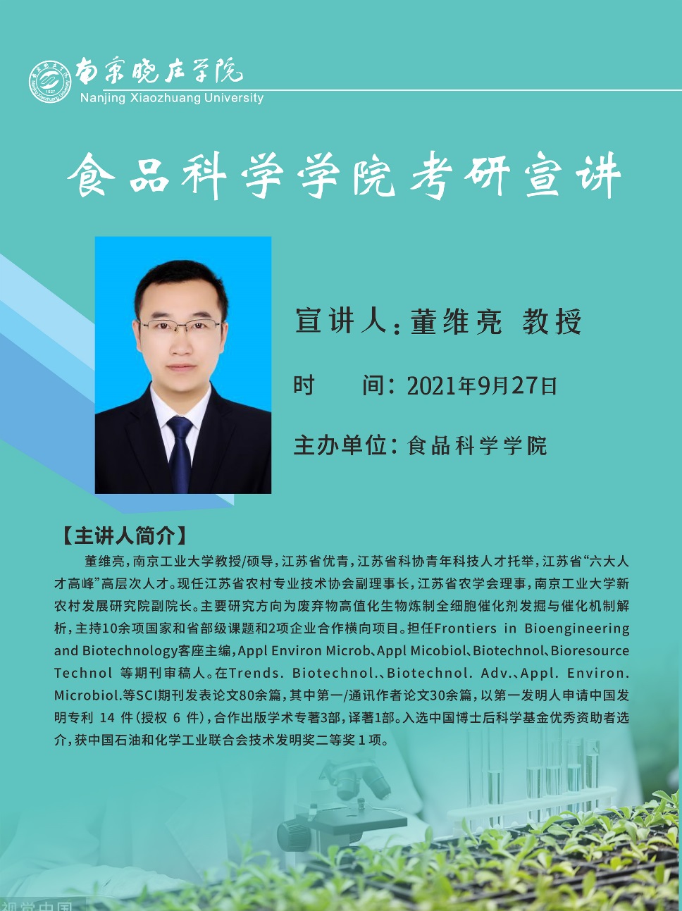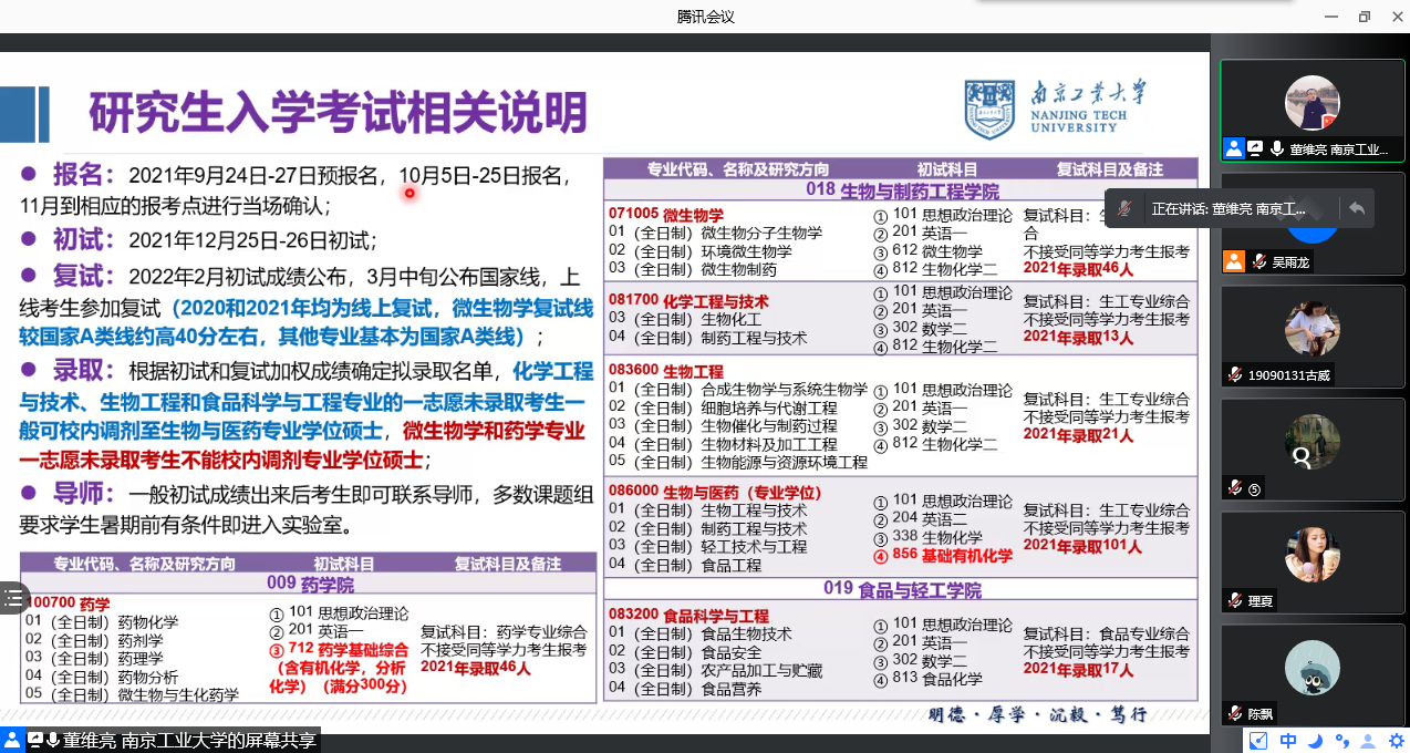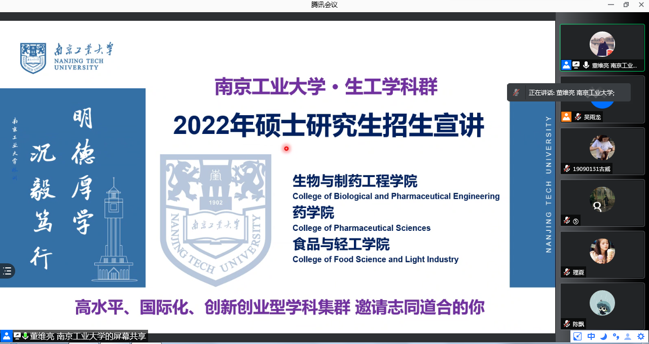 为激发学生考研积极性,帮助学生掌握相关考研技巧,了解更多考研专业资讯,我院考研协作高校,南京工业大学硕导、新农村发展研究院副院长董维亮教授,于9月27日线上为我院学生举办考研宣讲会,我院2018级全体学生和其他年级学生代表聆听了宣讲。活动由食品科学学院副书记吴雨龙主持。