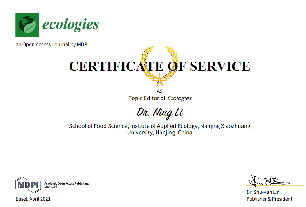 近日,我校食品科学学院李宁博士接到全球领先的开源(Open Access)出版公司MDPI的邀请,担任国际期刊Ecologies的专题编辑(Topical Editor)。Ecologies期刊是MDPI旗下的生态学领域的重要期刊。李宁博士主要负责动植物关系生态学、鸟类生态学相关稿件的评审和决审工作。