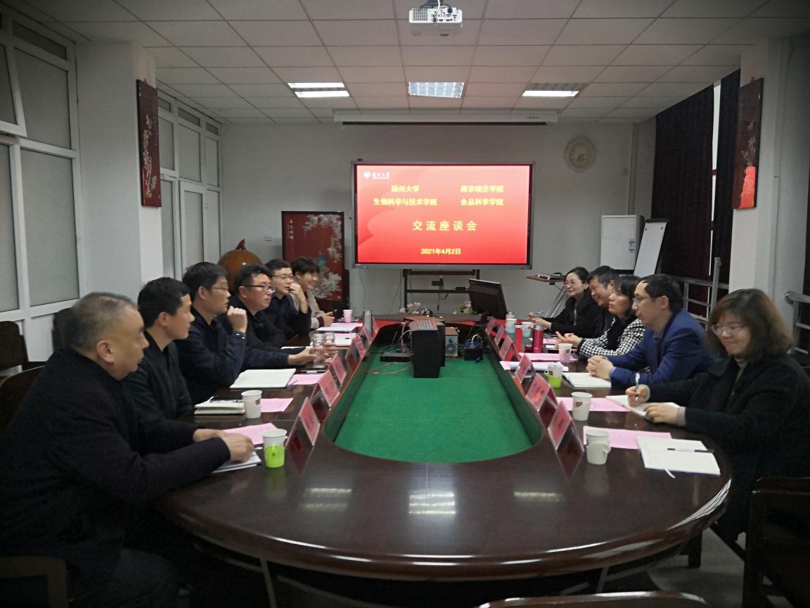 交流会上,扬州大学生物科学与技术学院副院长熊飞教授全面介绍了学院情况,并对学院的学科建设、专业建设、学院的“十四五”发展规划等方面的工作思路和战略举措进行了详细解读;生物科学系陈刚主任就生物科学人才培养方案、师范专业认证的准备等方面进行了经验分享。座谈中,双方还就人才培养、课程建设等方面进行了深入的探讨。通过此次调研,我校食品科学学院在学科与专业建设、专业硕士学位点申报等方面进一步厘清了思路、学习借鉴相关经验做法,这为学院精准施策,不断提高人才培养质量,提供了切实可行的办法和举措。