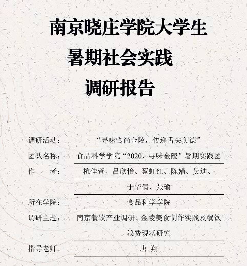 为全面提升大学生的综合素质,进一步培养可堪重用、能担大任的时代青年,同时为更好地将实践育人融入人才培养全过程,2020年食科院暑期社会实践,教育引领广大团员青年深入基层、走向社会,践行“教学做合一”理念,通过社会观察和亲身实践,用实际行动诠释当代青年大学生的责任和担当,对南京餐饮产业进行调研,开展金陵美食制作,同时重点调研高校餐饮浪费现象。调研报告《南京餐饮产业调研、金陵美食制作实践及餐饮浪费现状研究》最终获得2020年全省大中专学生志愿者暑期文化科技卫生“三下乡”社会实践活动优秀调研报告、2020南京晓庄学院暑期社会实践优秀调研报告。
