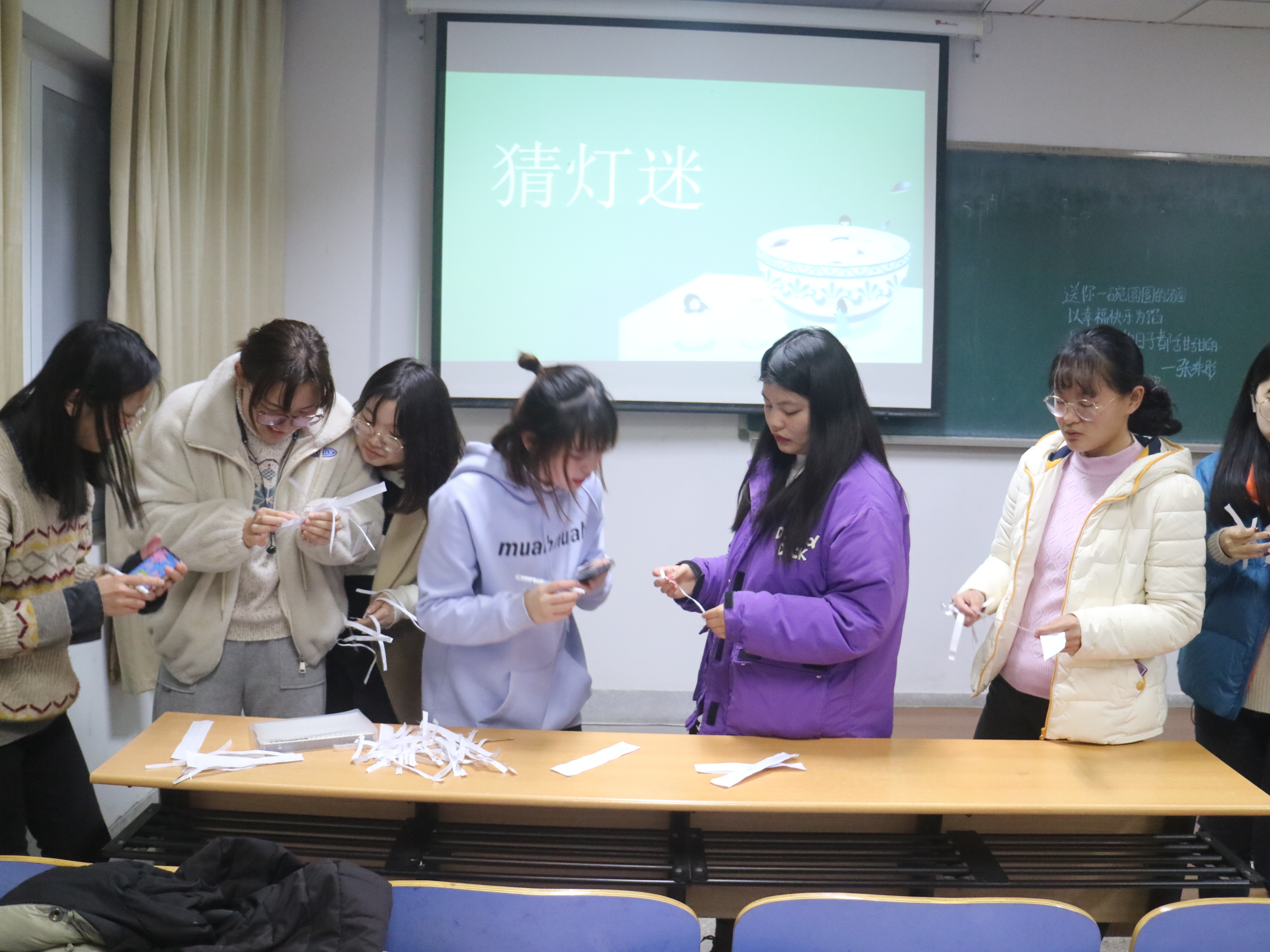 活动伊始,主持人介绍了元宵节的来历、习俗,让大家对中国的传统节日元宵节有了更深入的了解。随后进行的是猜灯谜环节,主持人准备了成语谜、地名谜、书刊诗词谜等多类型灯谜,内容着重突出人文性和趣味性,每位同学均有一次猜灯谜机会,猜中灯谜者可获得精美节日小礼品一份,活动新颖活泼,现场气氛热烈。最后进行的是“你猜我划”小游戏环节,将现代元素完美融合到传统节日当中,现场一片欢声笑语,让同学们置身于浓厚的节日氛围中,倍感节日的温馨,兴高采烈度佳节,其乐融融闹元宵。