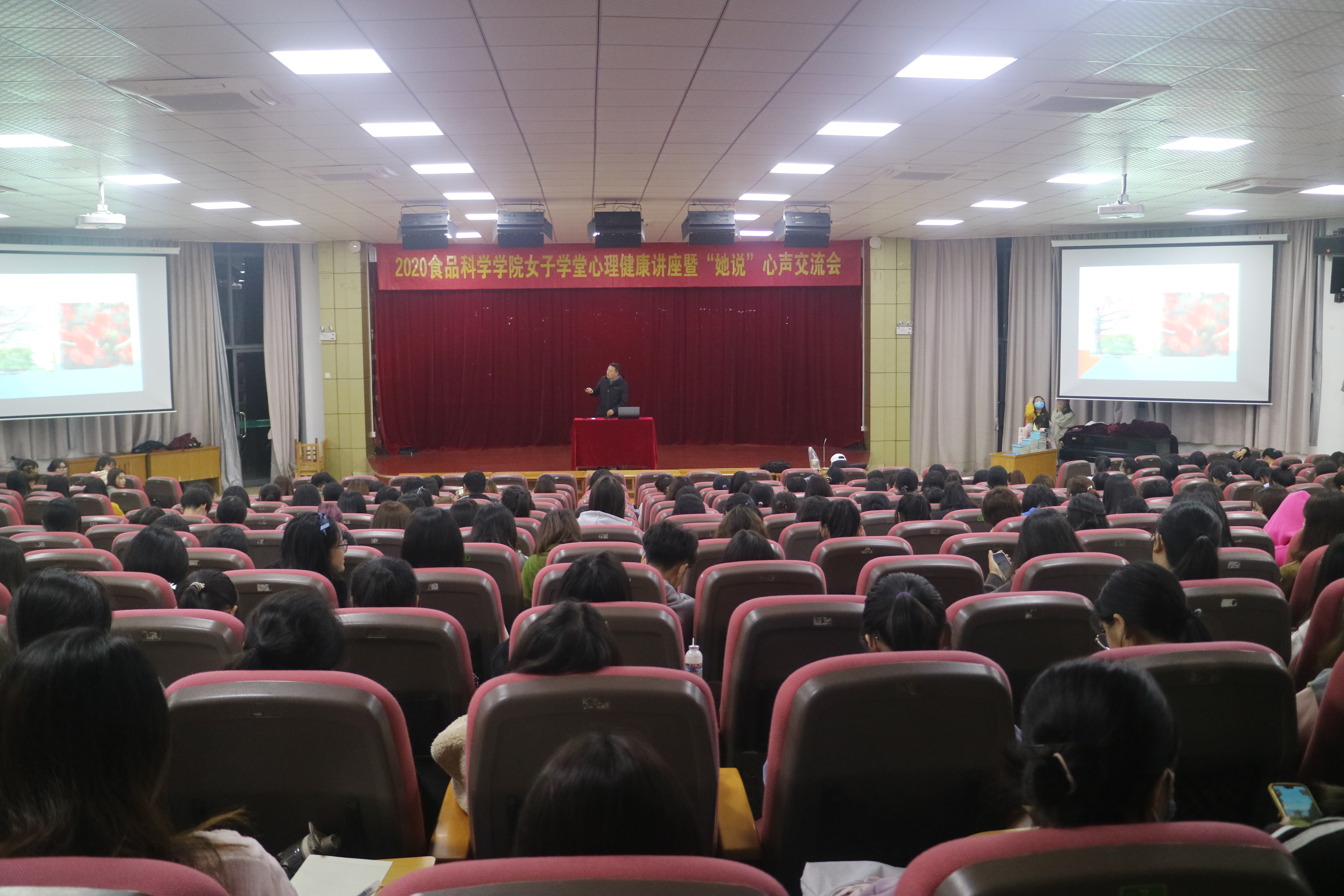 为加强我校女生心理健康教育,引导女大学生科学地进行心理调节,促进和谐校园建设,食品科学学院女子学堂于11月16日18点30分在方山校区中心报告厅为全校女生举办了一场别开生面的心理健康讲座,活动邀请到了校心理研究院李晓军教授主讲,全校近300人参加了此次讲座。