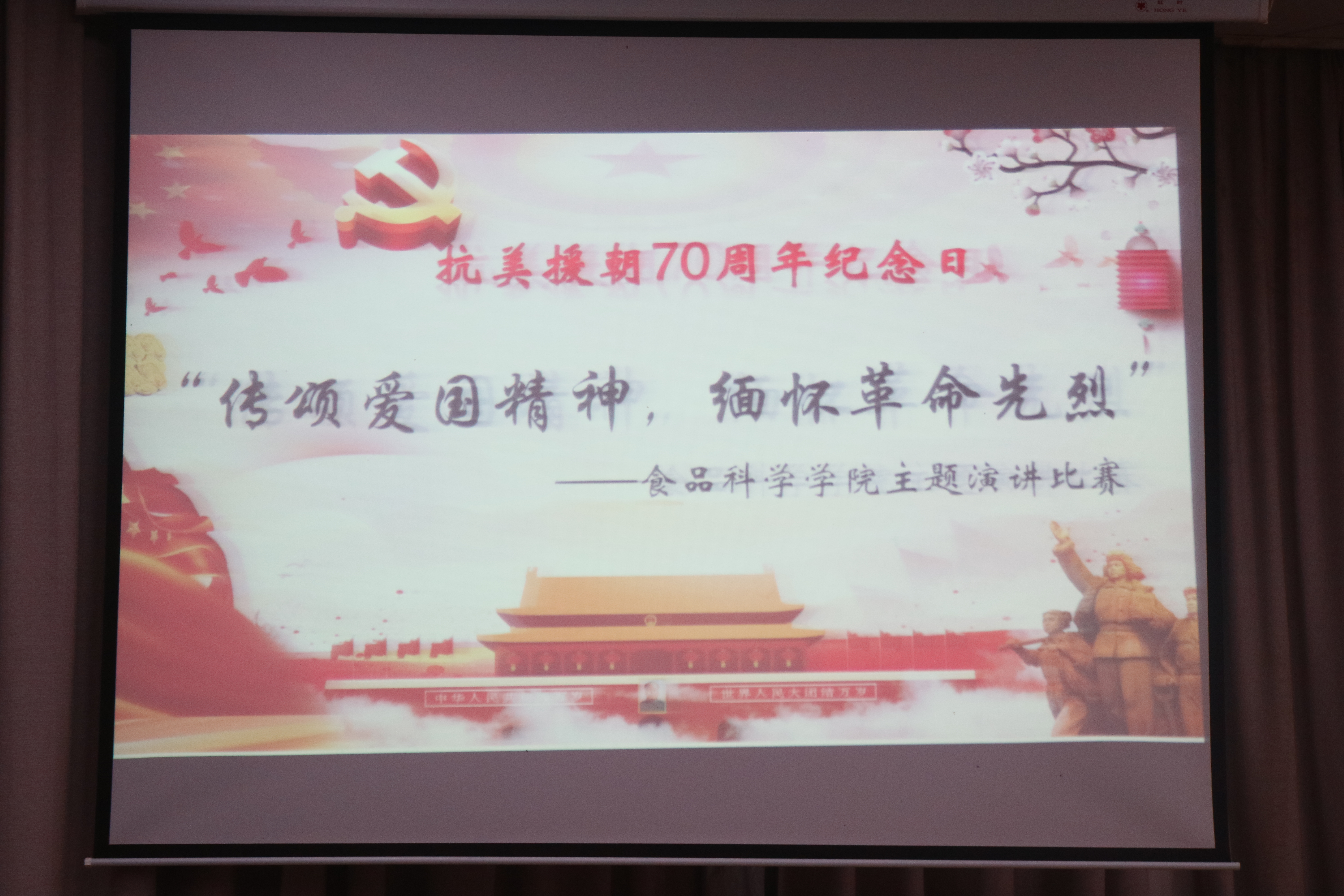 在纪念中国人民志愿军抗美援朝出国作战70周年之际,为弘扬爱国主义精神,铭记抗美援朝的光辉历程和伟大胜利,致敬中国人民志愿军的英雄事迹和革命精神,食品科学学院于10月25日在方山校区中心报告厅举办主题朗诵比赛,为全院学生上了一堂生动的爱国主义教育课。