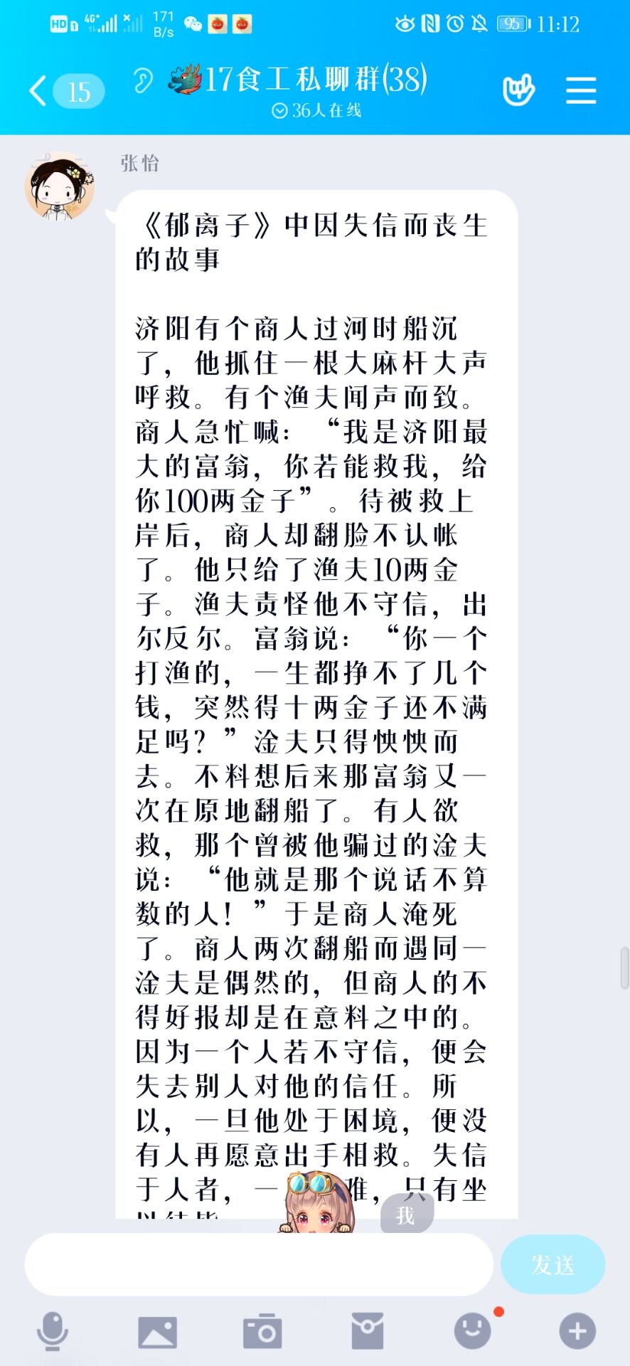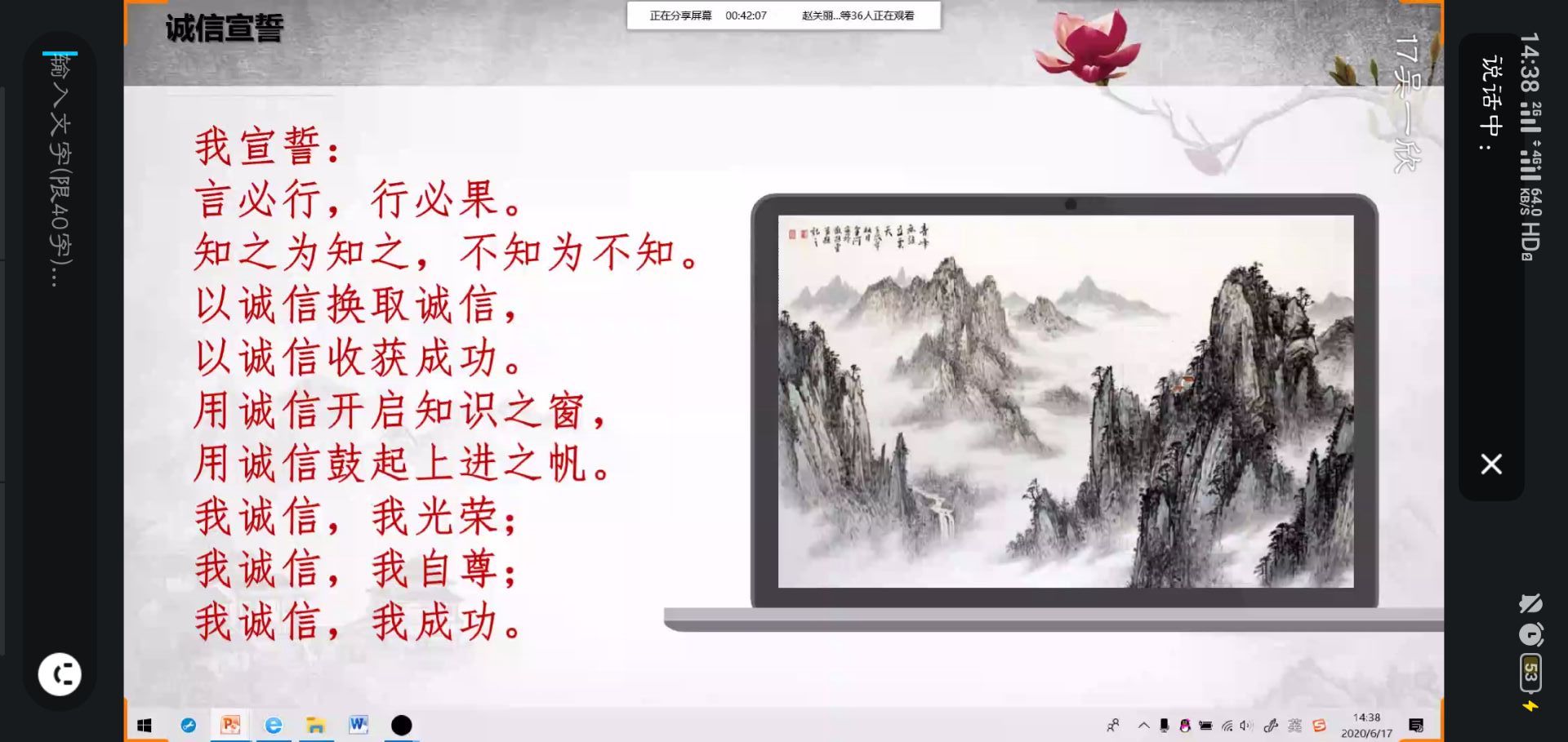 各班以线上与线下相结合的形式开展活动:18生师1班,在学习和讨论四则时事的同时,分享诚信小故事三则,并提出情景假设“如果世界失去了诚信”,全班同学踊跃发言探讨诚信重要性;18食品质量与安全班全体同学认真分析仝卓事件所反映的社会问题,讨论制定避免此类现象发生的方案;17食品科学与工程班开展诚信格言征集比赛,学习名人的诚信思想,签订诚信考试承诺书,要求大家从实际行动上履行诚信义务;17生物师范班的团干部们借助视频、实例讲解,组织同学们一起了解了张秋媛事件以及仝卓事件,并请代表发表对“诚信”的理解以及自己践行诚信的具体措施。通过参加此次诚信教育主题活动,大家纷纷表示深刻认识到,人无信不立、家无信不和、事无信不成、业无信不兴。在今后的学习生活中,要以诚信为根本,做一个有诚信的人。
