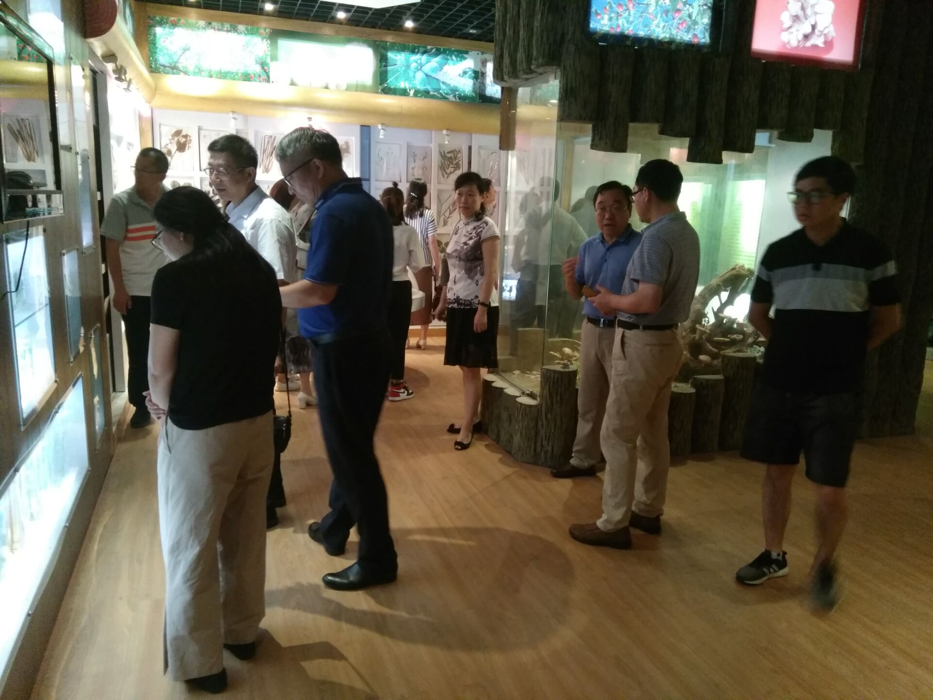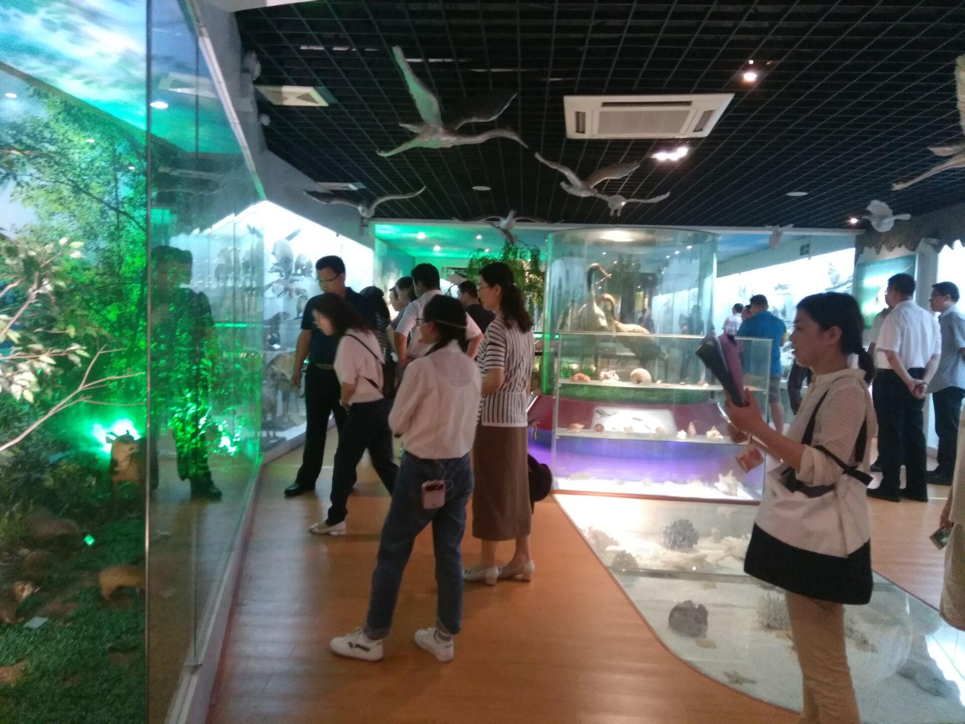 民盟盟员们在我院实验中心吴雨龙老师的带领下,逐一参观了植物标本展厅、腔肠动物门标本展厅、鱼类标 本展厅、浸制标本、两爬类及鸟类展厅及哺乳类标本展厅。参观过程中,民盟盟员们均表现出浓厚的兴趣,被馆内各种动植物标本深深吸引,尤其对馆内由我院院长李朝晖教授和虞蔚岩教授制作的各类蝴蝶和蜻蜓标本大加赞赏。我院标本馆志愿讲解小组同学为民盟党员们详细地讲解了各类标本知识。民盟盟员们对我院生物标本馆既能满足日常教学及科学研究,还可以面向社会承担科学普及工作表示肯定,一致认为该馆既是重要的教学实训基地,也是重要的科普宣传基地。