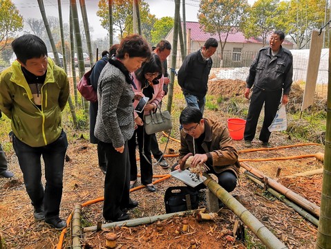 与会人员首先考察了振兴村竹林套种大球盖菇种植区生产和出菇情况,整个种植区小蘑菇长势喜人,令人振奋。振兴村是高淳区经济薄弱村,属丘陵地区,农业生产条件有限。南京食用菌产业技术研究中心利用当地山林资源丰富,因地制宜,引进新品种大球盖菇开展竹林套种新模式示范,既增加经济效益,促进农民增收,又消化利用掉秸秆,起到良好生态效益。小蘑菇扶贫模式受到当地农民欢迎。