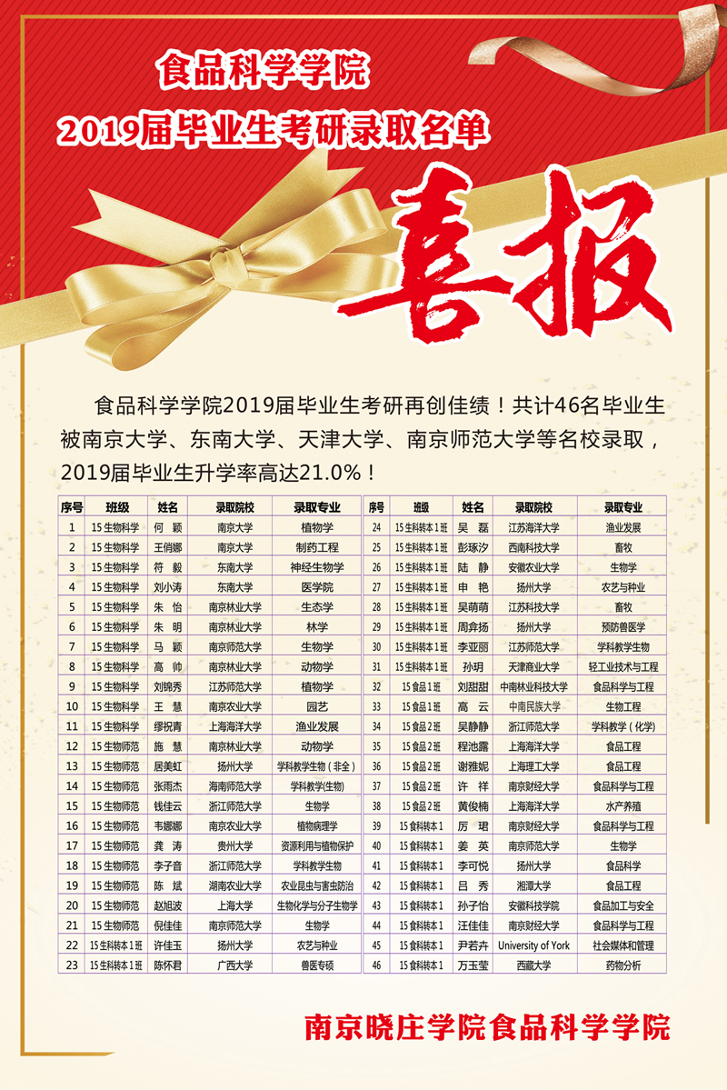 食品科学学院2019届毕业生考研录取光荣榜