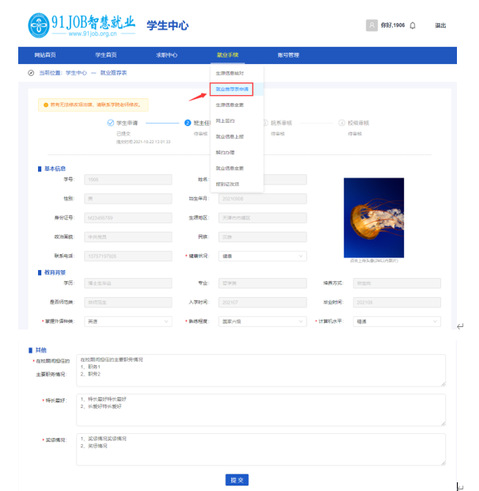 学生提交就业推荐表申请,待学校审核通过后,由学校打印就业推荐表和空白协议书。填写健康状况、教育背景、在校期间任职情况等相关信息,提交成功后,等待学校审核。