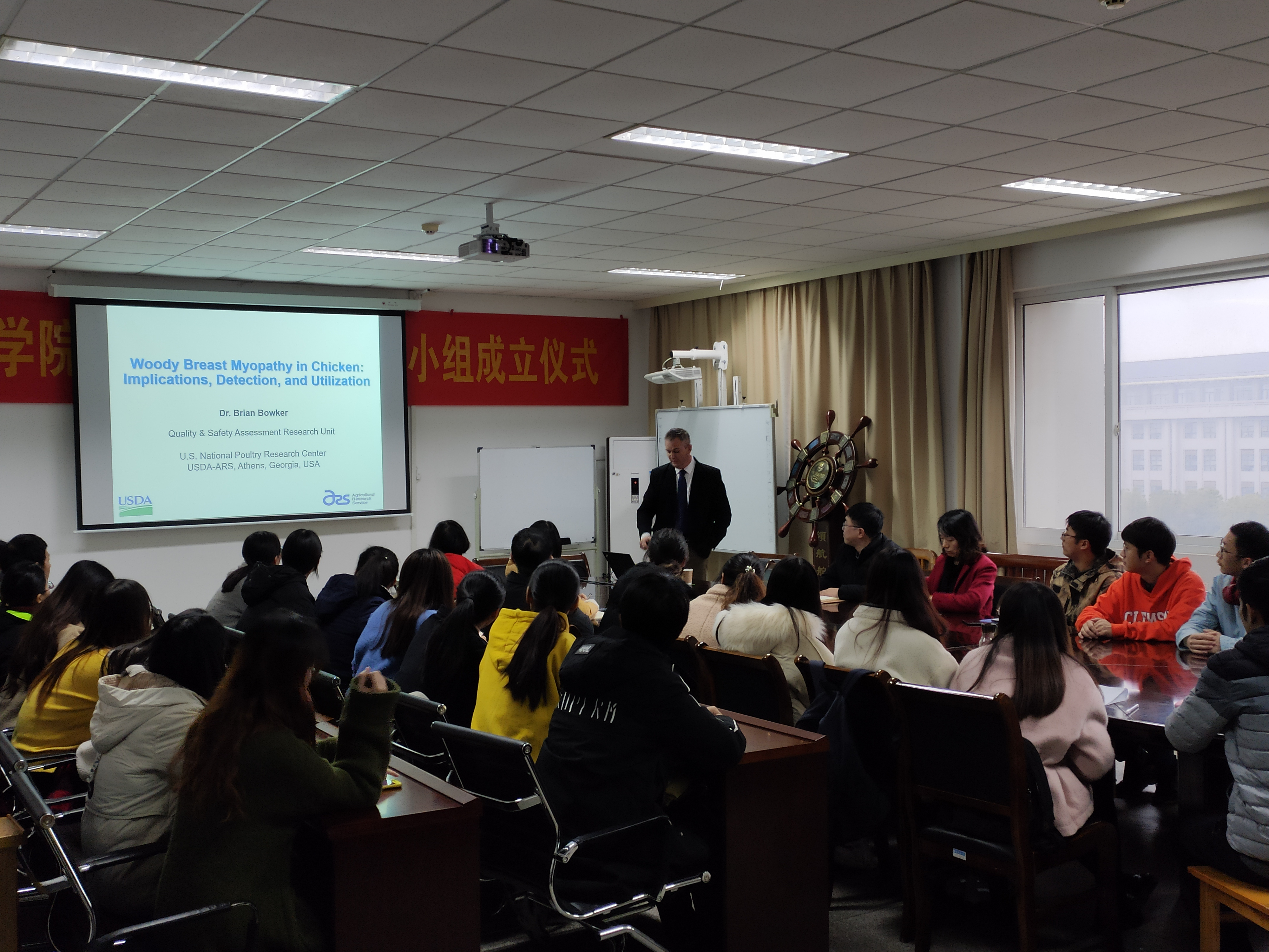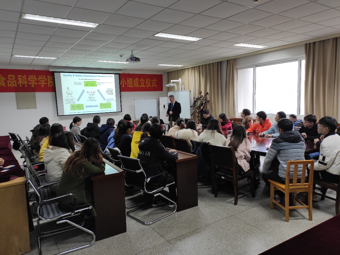 2019年12月17日下午,美国国家家禽研究中心(U.S. National Poultry Research Center)质量与安全评估研究部(USDA-ARS)的食品工程研究员Bowker教授在我院作了题为“Woody Breast Myopathy in Chicken: Implications, Detection, and Utilization”的学术讲座,讲座由食品科学学院汪振炯副院长主持,食品科学学院党总支书记贲爱玲、副院长陈全战及相关教师同学们参加了讲座。