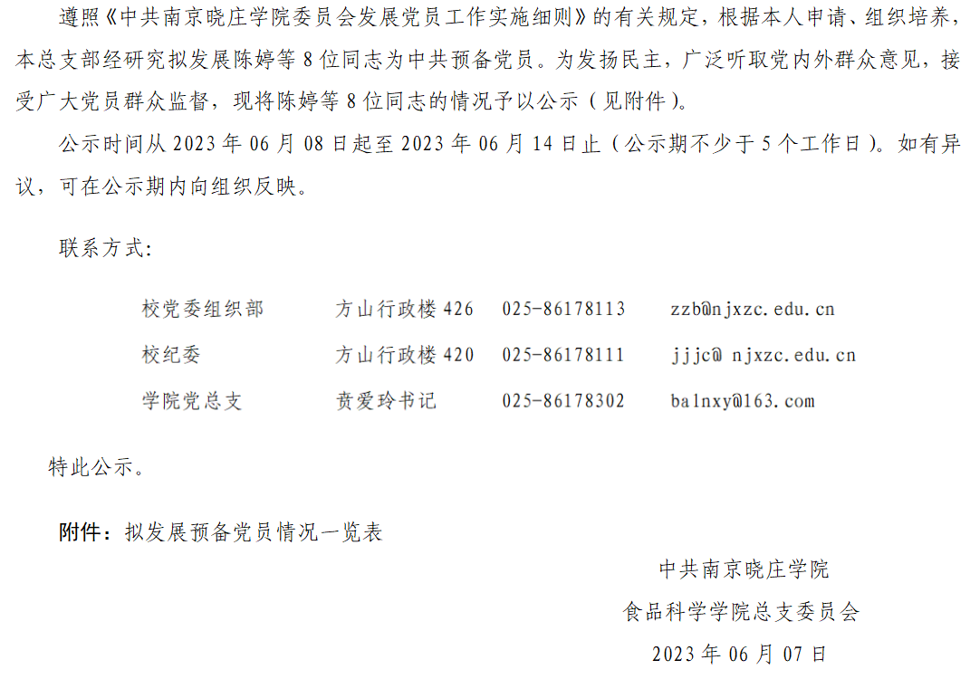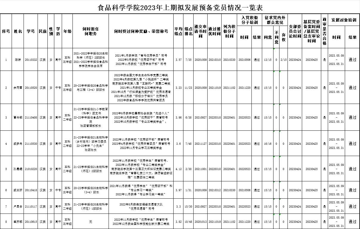 食品科学学院党总支2023年上半年拟发展预备党员公示