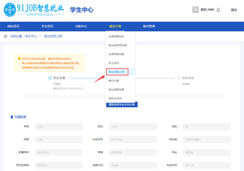学生登陆成功后在学生中心点击【就业手续】->【就业信息上报】选择对应信息,点击“下一步”,进入二级引导页。再选择“毕业去向分类”,点击“下一步”,进入信息填报页面。
