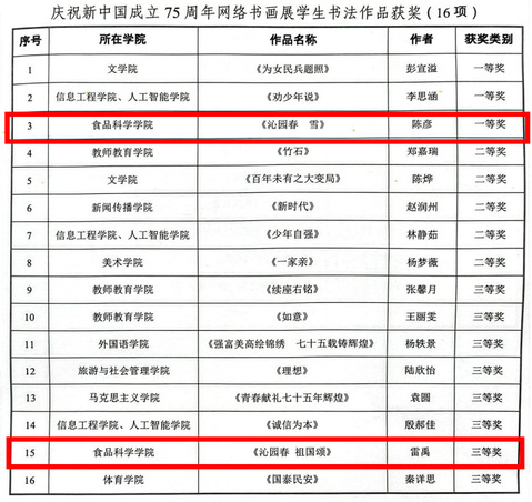 1 | 食品科学学院 | 《沁园春雪》 | 陈彦 | 一等奖 |