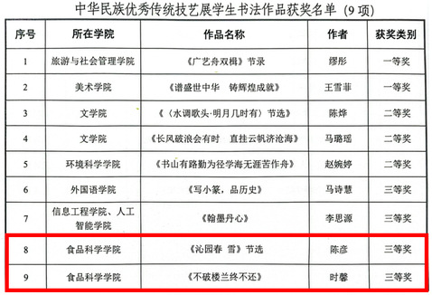 根据《关于组织开展第二届“铸牢中华民族共同体意识·高校在行动”系列活动的通知》要求,我校开展“铸牢中国心,凝聚奋进力”系列活动。食品科学学院高度重视本次活动,精心策划,师生积极参与其中,最终我院陈彦同学书法作品《沁园春 雪》节选获三等奖,时馨同学书法作品《不破楼兰终不还》获三等奖,特此通报表扬。