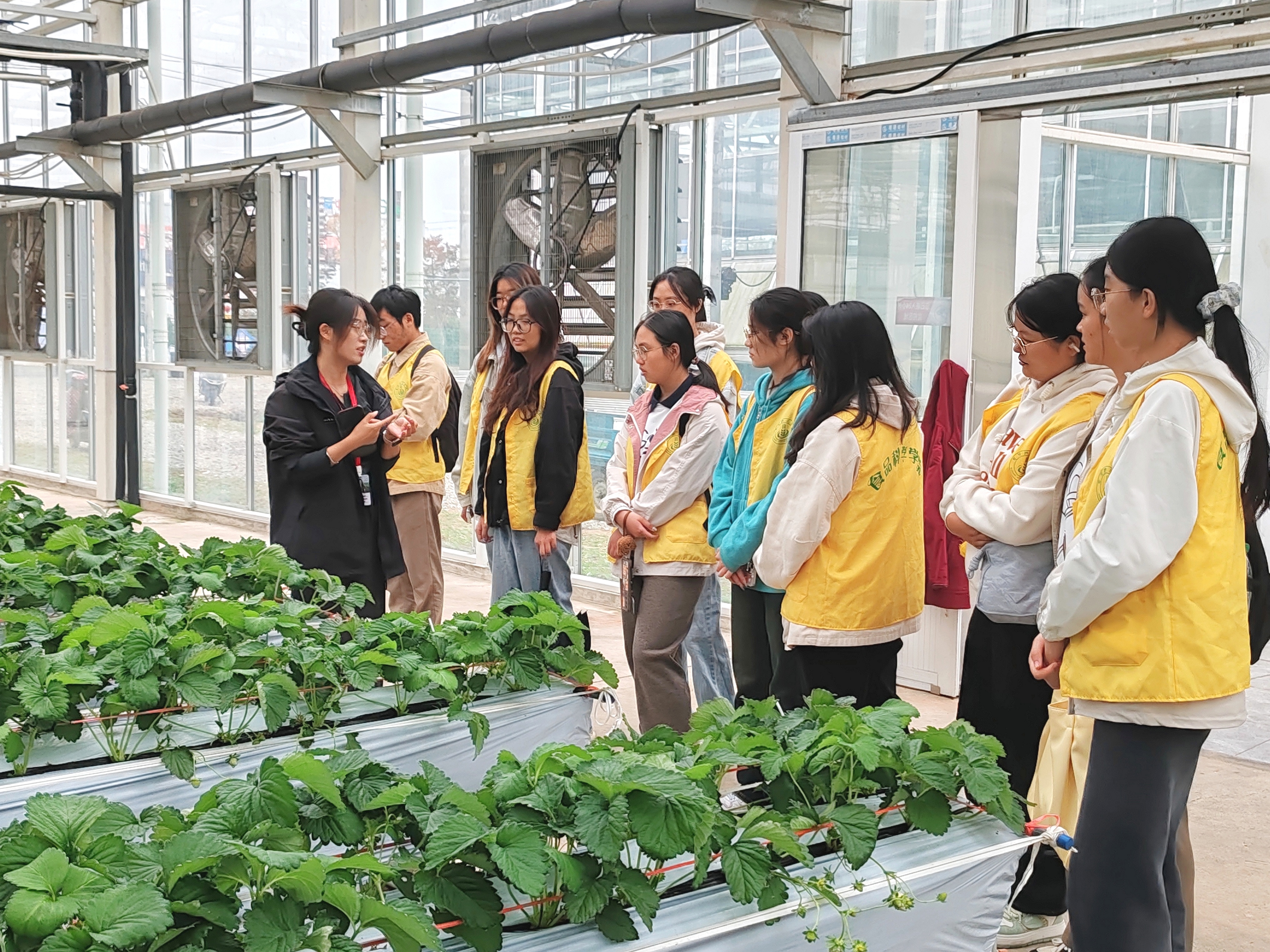 同学们参观了金色庄园草莓的“种植、分选、包装、质检”等环节,从“生产、保鲜、销售”多方面学习了金色庄园草莓产业模式。在草莓大棚,学习了马卡龙草莓等新产品知识,现场见证了科研创新与产业的深度融合,进一步拓宽了视野,激发了创新创造的热情。