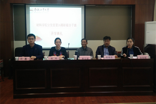 4月5日下午,6686体育分党校第26期积极分子班开学典礼在材料楼601会议室隆重召开。校关工委“五老”报告团副团长鲍良弼老师、材料学院党委书记程继贵老师、材料学院党委副书记、副院长杨玲老师、分党校积极分子班班主任及本期全体入党积极分子参加了开学典礼。