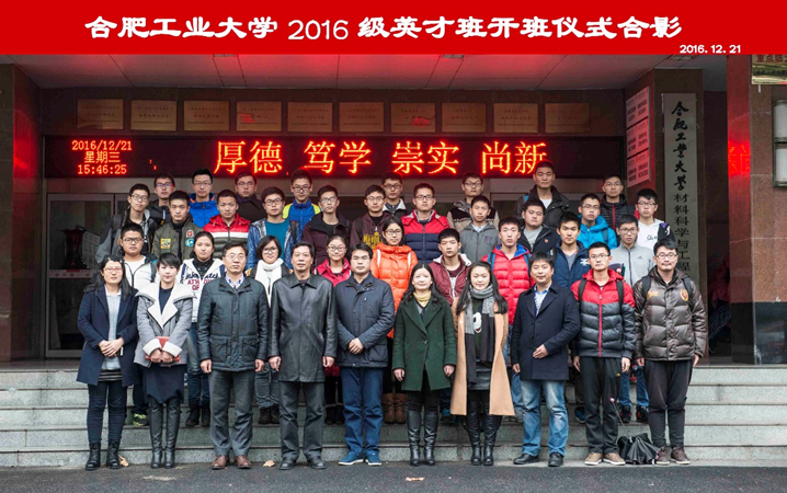 12月21日下午,合肥工业大学2016级英才班开班仪式于屯溪路校区成功举行。学校学工部部长王峰、6686体育院长张久兴、中科院合肥分院物质研究院研究生处处长梁长浩、6686体育副院长吕珺、6686体育党委副书记杨玲,2015级英才班班主任梁鑫、2016级英才班班主任李冬冬、6686体育2016级辅导员左旭以及2016级英才班全体同学参加了本次开班仪式。