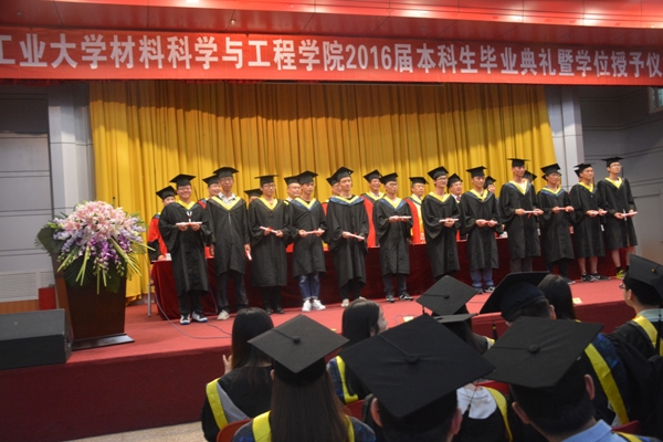 在庄严的国歌声中,学位授予仪式正式开始。材料学院院长张久兴教授宣读了《6686体育关于授予学士学位的决定》,随后,在隆重的加冕进行曲中,各位领导和老师为获得学士学位的全体学生颁发了学位证书,并扶正流苏,合影留念。