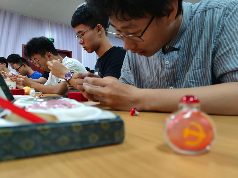 在动手作画环节中,同学们参与热情高涨。2019级辅导员葛海涛老师感慨道:“小小的党徽凝聚了一代又一代共产党人的接力奋斗,百年坎坷,百年壮阔。这非遗内画看着容易但做起来却很有难度,希望全体材料人能继承内画人的工匠精神,学好专业,立大志成大才。”