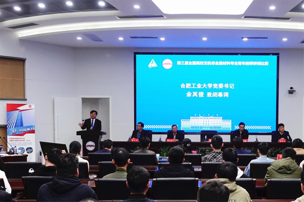 11月6至7日,第三届全国高校无机非金属材料专业青年教师讲课比赛在我校成功举办。合肥工业大学党委书记余其俊,党委常委、副校长吴玉程、季益洪,中国科学院院士、合肥工业大学教授俞书宏,合肥水泥研究设计院有限公司副总经理张永龙等出席比赛开闭幕式。中国工程院院士、武汉理工大学材料学科首席教授张联盟,中国工程院院士、中国建材料联合会科教委主任彭寿以视频等多种方式出席比赛。