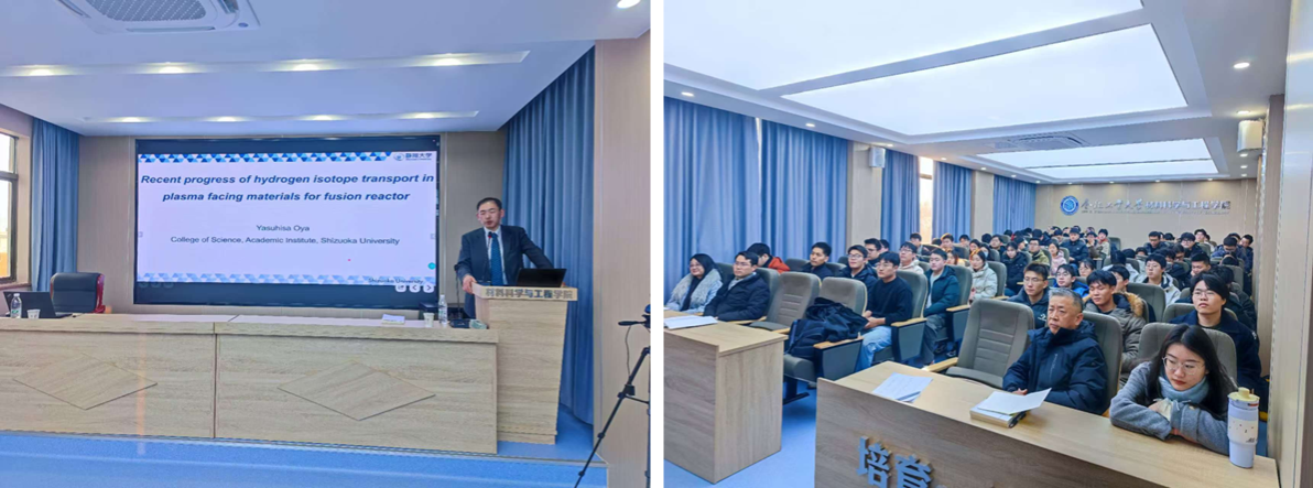 访问期间,大矢恭久教授为师生们带来了两场精彩的学术报告。他深入浅出地讲解了核裂变和核聚变的基础知识,并详细介绍了静冈大学在面向等离子体材料中氢同位素输运行为的研究进展。报告内容丰富、视野开阔,为师生们提供了前沿的学术信息,并激发了大家对未来科研方向的思考。此外,大矢恭久教授还参观了先进聚变堆材料实验室,了解实验室的科研设施、研究方向及主要成果,对实验室的科研实力给予了高度评价。