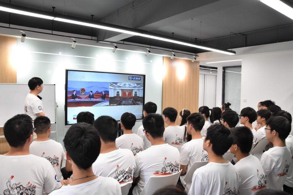 本次主题团日活动分为微团课、学习研讨和重温入团誓词等环节。上午9时许,同学们统一着班服、戴团徽来到学生成长社区。团支部书记周文韬以百年团史为主线,用清晰的时间脉络、发人深省的故事、鲜活生动的案例,带领全体同学学习回顾了中国共青团百年光辉历程,深刻缅怀了百年历程中涌现的杰出青年先辈。随后,全体同学共同收看了庆祝中国共产主义青年团成立100周年大会,聆听了习近平总书记在大会上的重要讲话。会后,同学们围绕总书记重要讲话、百年团史、青年责任担当等发表了学习感悟。最后,在团支部书记的带领下,全体团员在鲜红的团旗下重温入团誓词,用青春的名义宣誓,用行动践行“请党放心,强国有我”的铮铮誓言。