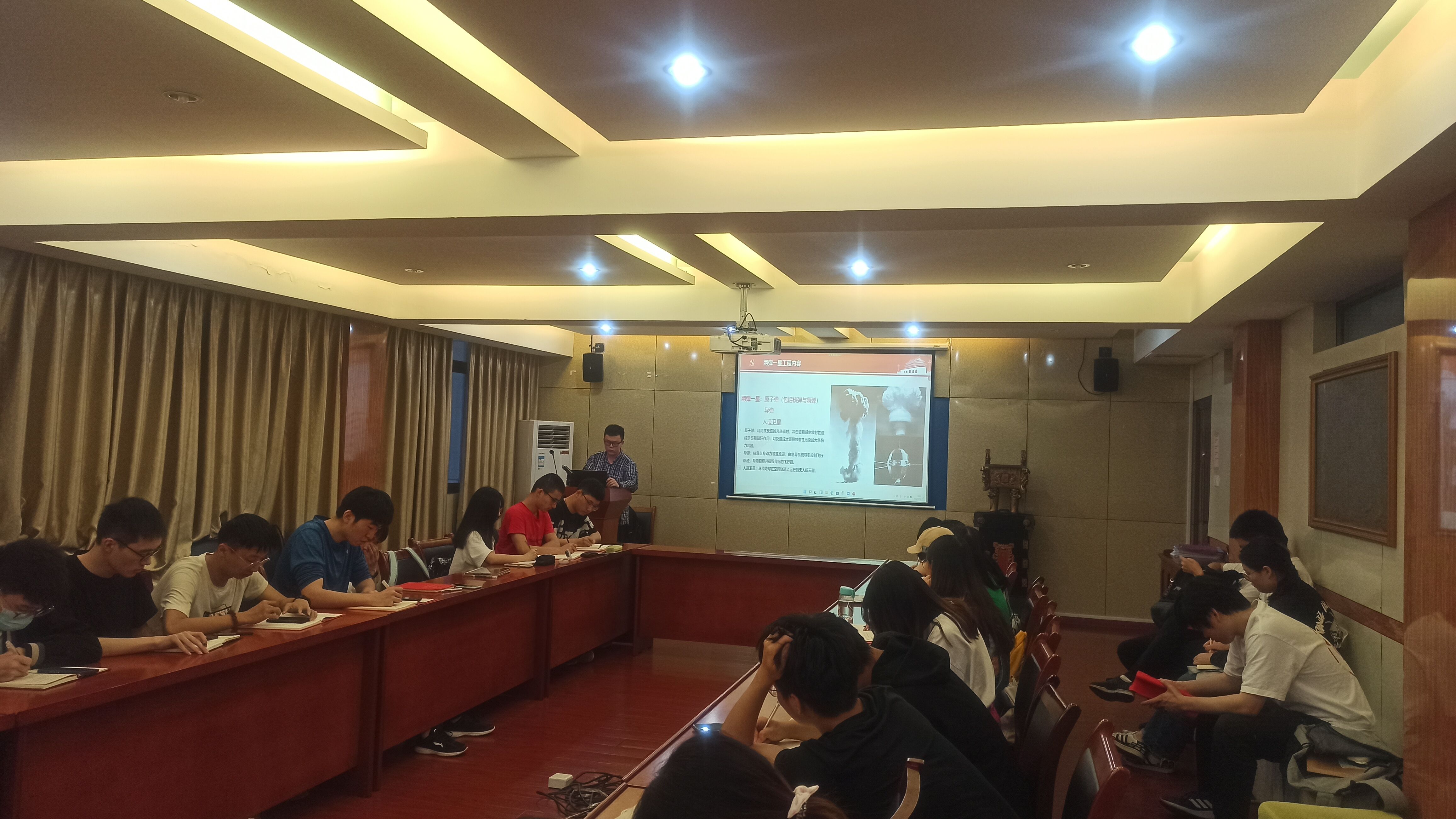 材料学院本科生第三党支部于5月16日晚在材料楼多功能会议室开展“弘扬两弹一星精神”专题学习活动。本次活动由预备党员王梓安同志主持,支部全体成员(含预备党员)通过线上线下方式参加活动。