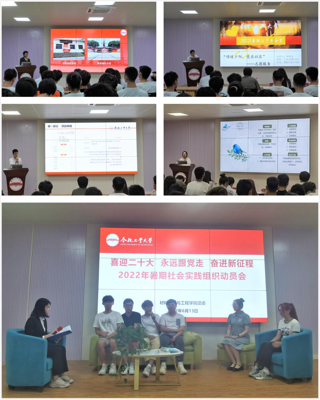 “以将心守初心,以无悔致青春”暑期社会实践团队负责人、社会实践优秀标兵王业翔介绍了他们赴湖南、重庆等地寻访彭德怀、罗荣桓、聂荣臻和刘伯承等将帅故居,追寻“将心”,缅怀革命先烈,传承红色精神的生动实践故事。“凝聚青春力量,助力乡村振兴”暑期社会实践团队负责人、社会实践优秀标兵王家辉分享了他们走访调研我校选调生代表王萌萌、张铁鑫、戴迎春、圣玉祥等人助力脱贫攻坚和乡村振兴中的生动实践。“童心向党,七彩假期”暑期社会实践团队负责人周文韬讲述了他们围绕思想引领、文明生活、身心健康、科技创新、快乐学习、艺术素养、文化传承等方面开展支教故事。“情暖夕阳,爱在社区”暑期社会实践团队负责人邹晓龙讲述了他们赴合肥市经开区芙蓉社区开展关怀空巢老人实践故事。赴苏皖地区材料行业考察调研团负责人王语韩讲述了他们走访材料类企业的见闻感悟,号召同学们砥砺工业报国情怀。