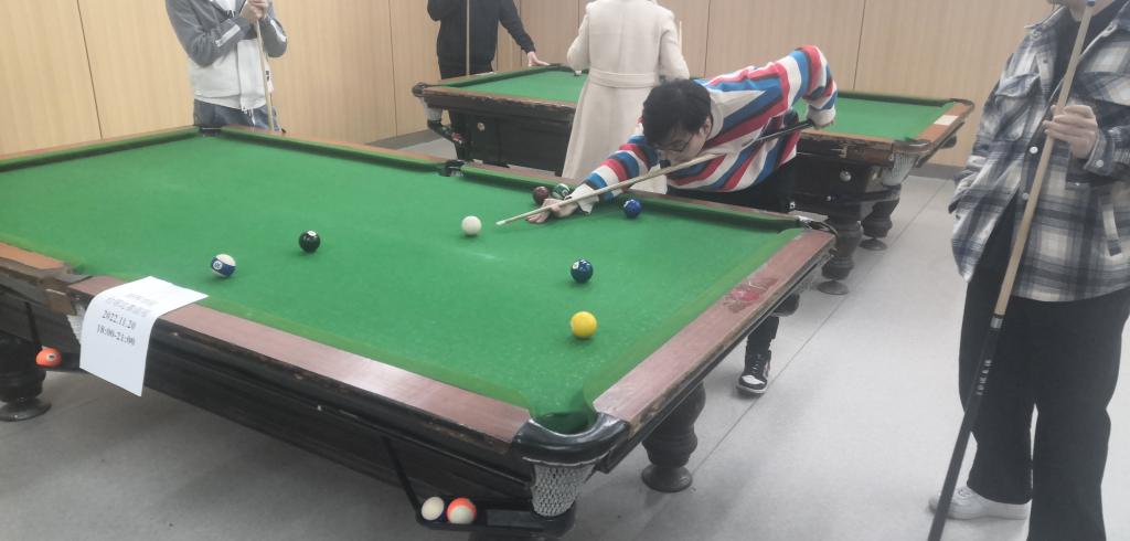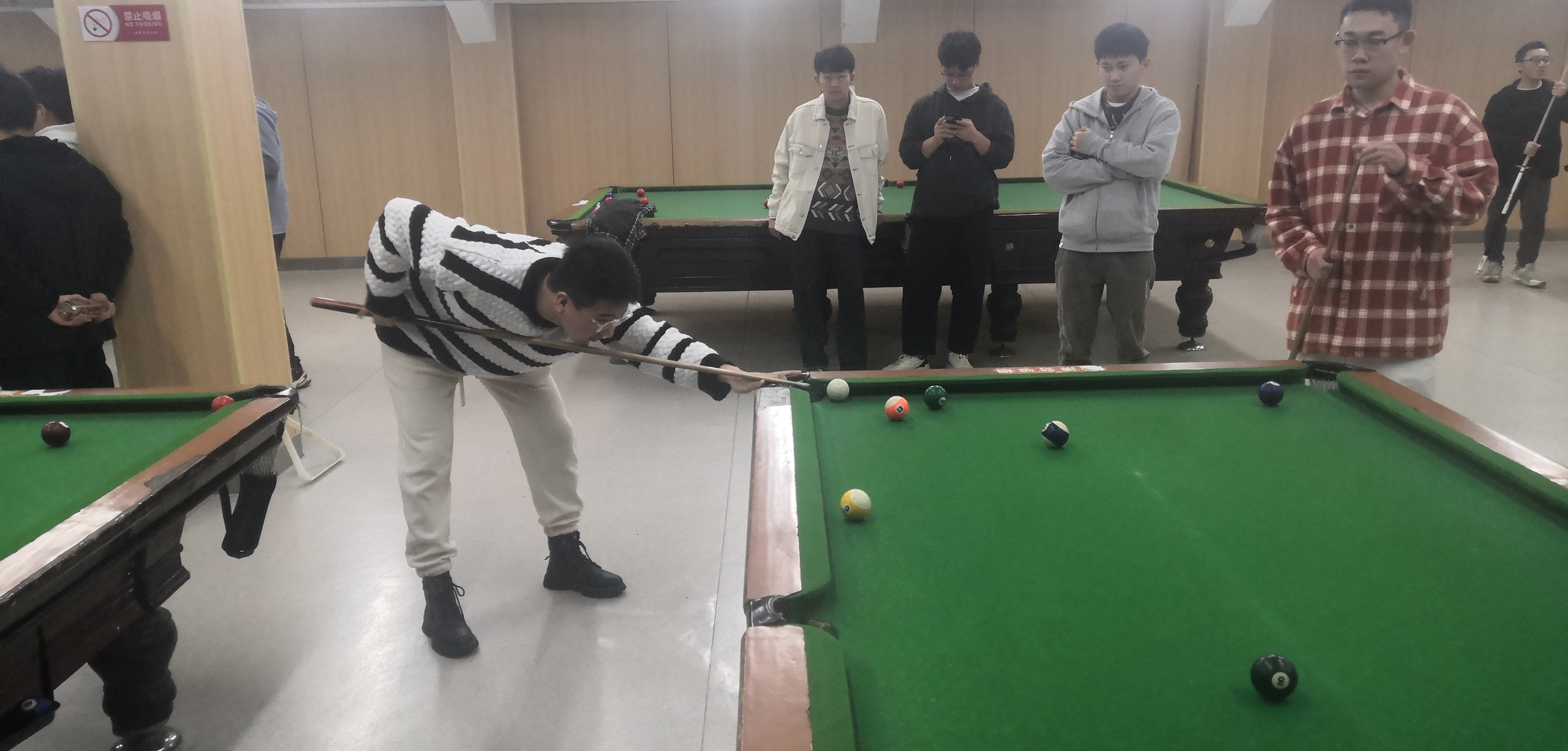 本次比赛按照抽签的结果进行了13组比赛,紧张的比赛持续了两个小时,选手们一张一弛彰显绅士风范,每一杆每一球都犀利无比,精湛的球技也表现得淋漓尽致。这是一场精彩的预选赛,同时又是一场球技与友谊的交流。在整场比赛中最精彩的当属最后冠军的对决,台球上,每一个没有直接进球时碰撞的角度和力度,都被选手精准预判,让人拍手称快。最后,2022级材料学专业的黄一瑾同学以其及其刁钻的角度和与之配合的力度在比赛后期迅速掌控了全局,夺得了冠军。
