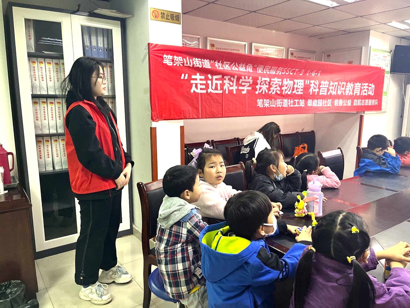 3月12日上午,2名学生志愿者前往翠庭园社区党群服务中心,与中国科学技术大学志愿者讲师一同为小朋友们讲授了一节富有乐趣的科普教育课,通过课堂板书讲解,手工实践项目以及科学小实验,小朋友们了解了更多科学知识,掌握了实验方法,获益匪浅。