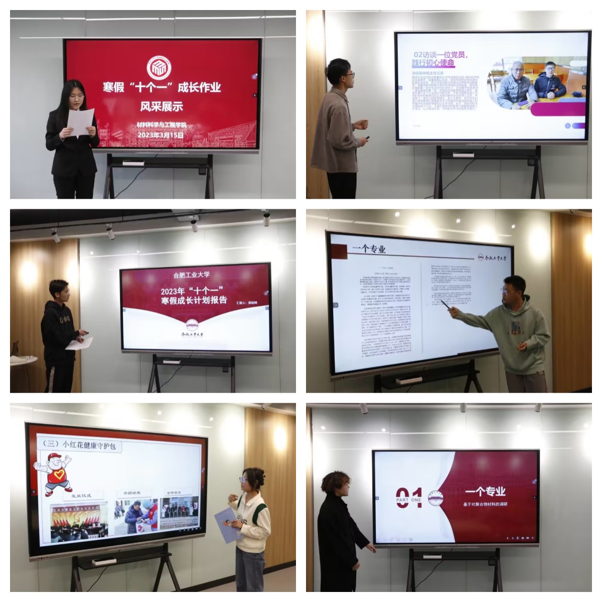 本次活动以“学习二十大,奋进新征程”为主题,引导2022级新生放眼看社会,结合返家乡社会实践等多种形式,设计了寻味“一封家书”,品味时代家国情怀、访谈“一位党员”,践行初心使命、探索“一个专业”,培育学科志趣、开展“一场宣讲”,做好形象代言、打卡“一个足迹”,赓续红色血脉、调研“一座家乡”,感悟伟大变革、开展“一次志愿”,弘扬志愿精神等十项内容,学院300余名大一新生完成了本次寒假成长作业。经个人申请、班级推荐,共有32名同学进入了学院展示评比环节,在寒假期间同学们寻访初心故事,实地走访老党员、走进高中母校,宣传自己的大学、深入基层一线,服务奉献青春。材料类22-4班陈子聪同学以“心怀梦想,勇攀高峰”为主题,讲述了他完成六项作业的经历,他回到母校宣讲,全面宣传了合肥工业大学,为家乡人民,家乡同学搭建起与工大之间有效沟通的桥梁;材料类22-3班的四名同学组成团队,精心制作了一个展示他们与老党员面对面访谈的精彩的视频;材料物理22-1班赵宝华同学从学习雷锋精神,撰写家书,参加劳动等方面展示了他的寒假作业成果,讲述了寻访一所贫困家庭的经历与收获。