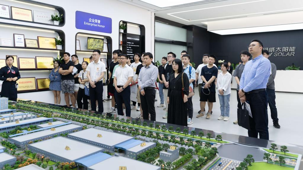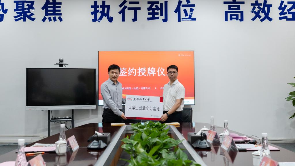 双方代表举办通威太阳能(合肥)有限公司与合肥工业大学大学生就业实习基地签约暨揭牌仪式,签署《共建合肥工业大学大学生就业实习基地协议书》,并为基地揭牌,与会成员共同参观并就求职和发展进行深入交流。