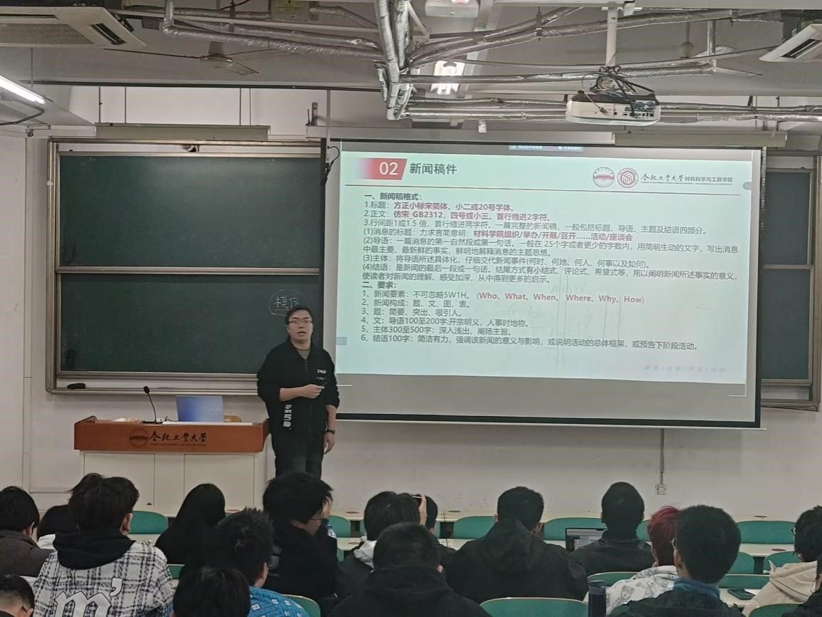 为提升学生骨干的技能水平,近日,材料学院在翠九教201举办“斛兵材子”培训班第四讲——常用文稿撰写培训。2023级辅导员葛海涛和第44届学生会轮值主席李甲庚受邀作为主讲人,50余名学生骨干参训。