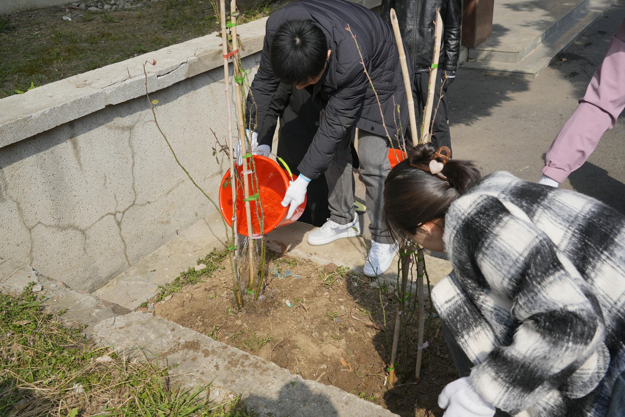 上午,在材料楼前的植树现场,材料学院机关党支部和本科生第二党支部师生热情饱满,齐心合力,干劲十足。师生一起挥锹铲土、栽种花苗、培土浇水,每道工序都一丝不苟,现场有条不紊的劳动场景成为材料楼前一道美丽的风景线。一番井然有序的忙碌后,一棵棵新栽种的月季花苗亭亭玉立。