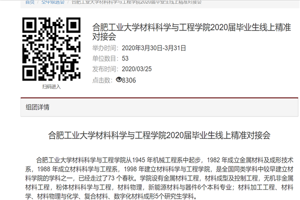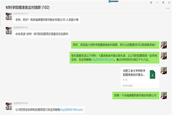 为更好地推动就业工作,进一步提升毕业生与用人单位的交流平台,帮助2020届毕业生丰富就业资源,拓宽就业渠道,材料学院于3月30日至3月31日,举办2020届毕业生线上就业精准对接会。