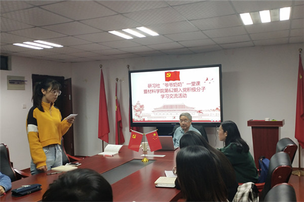 风雨沧桑七十载,中华大地换新颜。新中国七十年栉风沐雨地走来,创造了无数令世界惊叹的成绩。为充分利用爱国主义教育资源,拓宽对入党积极分子的教育渠道,深入学习了解70年来中国共产党人带领祖国人民取得的辉煌成就。10月24日晚,材料学院(屯溪路校区)第62期入党积极分子班学员与研习社成员一同在材料学院党员之家开展了由钟玉海教授主讲的 “爷爷奶奶”一堂课暨《习近平关于“不忘初心,牢记使命”论述摘编》原著领读学习活动。