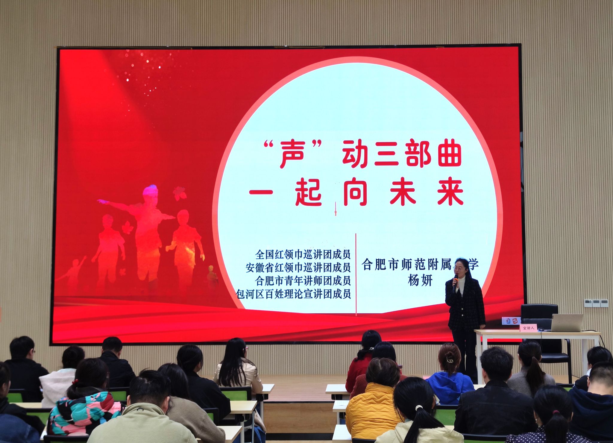 共建仪式结束后,与会全体成员参加了“青年宣讲进基层”活动。活动中,安徽省少工委副主任、全国红领巾巡讲团、合肥市青年宣讲团成员、合肥市师范附属小学教师杨妍和全国少先队名师工作室负责人、安徽省少工委委员、合肥市万慈小学党支部书记、校长王玲玲分别以“‘声’动三部曲,一起向未来”和“青春强国,挺膺担当”为主题,带领全体成员深入学习了习近平新时代中国特色社会主义思想的核心要义,重点围绕“两个结合”“六个必须坚持”“十个明确”“十四个坚持”“十三个方面成就”等开展了学习研讨,不断增进对党的创新理论的政治认同、思想认同、理论认同、情感认同,引导广大青年将个人理想融入到国家理想、社会发展中去,为社会主义现代化强国建设贡献自己的青春力量。
