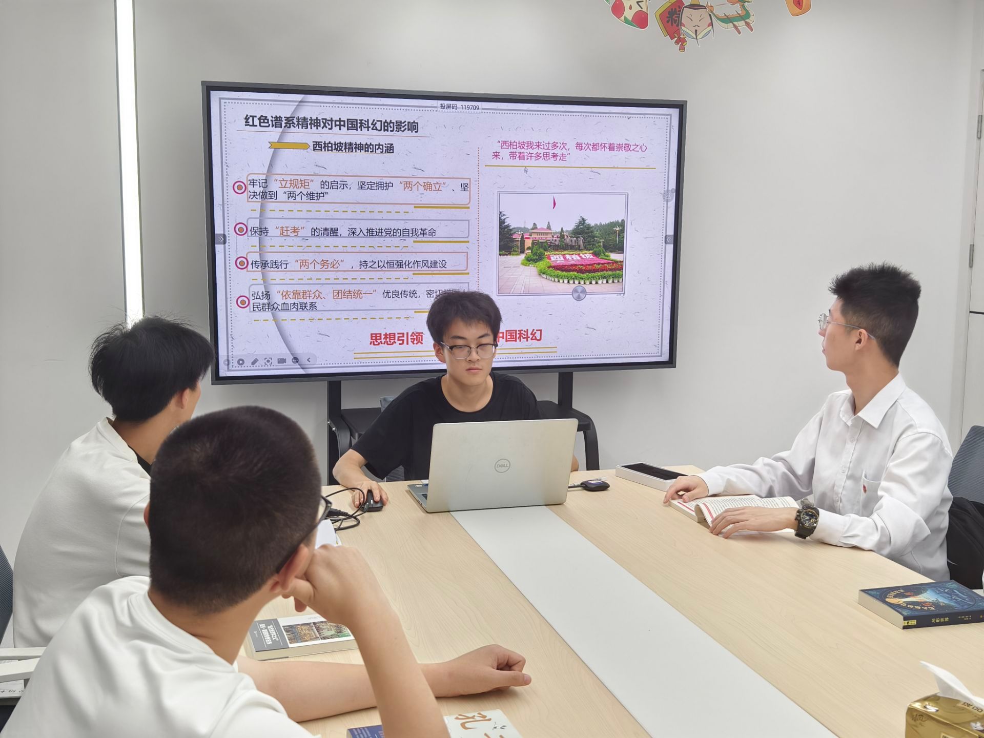 活动现场,同学们围坐一堂,气氛热烈而庄重。宣讲团的成员们首先通过PPT展示了西柏坡精神和两弹一星精神的历史背景和产生过程,引导大家深入理解这两种红色精神的核心内涵和时代价值,同时结合中国科幻作品的发展历程,分析了这些红色精神如何在中国科幻文学中得以体现和传承。