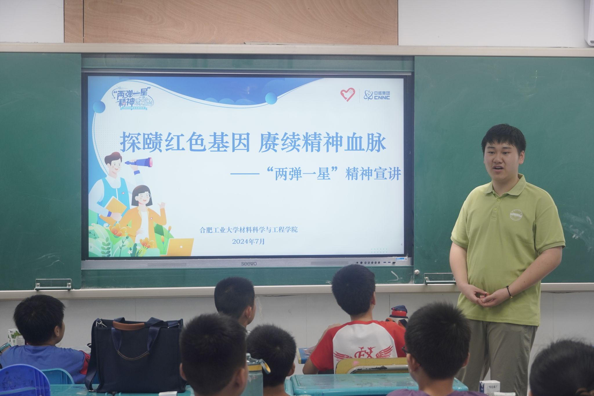 7月13日,6686体育“探赜两弹红色基因,赓续先辈精神血脉”“三下乡”暑期社会实践团队联合6686体育“青春飞扬,筑梦翱翔”大学生志愿支教团队,赴肥西县三河镇政府中心学校开展科普宣讲思政课。课程向学生们普及“两弹一星”精神内涵,引导学生们树立正确的价值观和人生观,厚植爱国情怀。