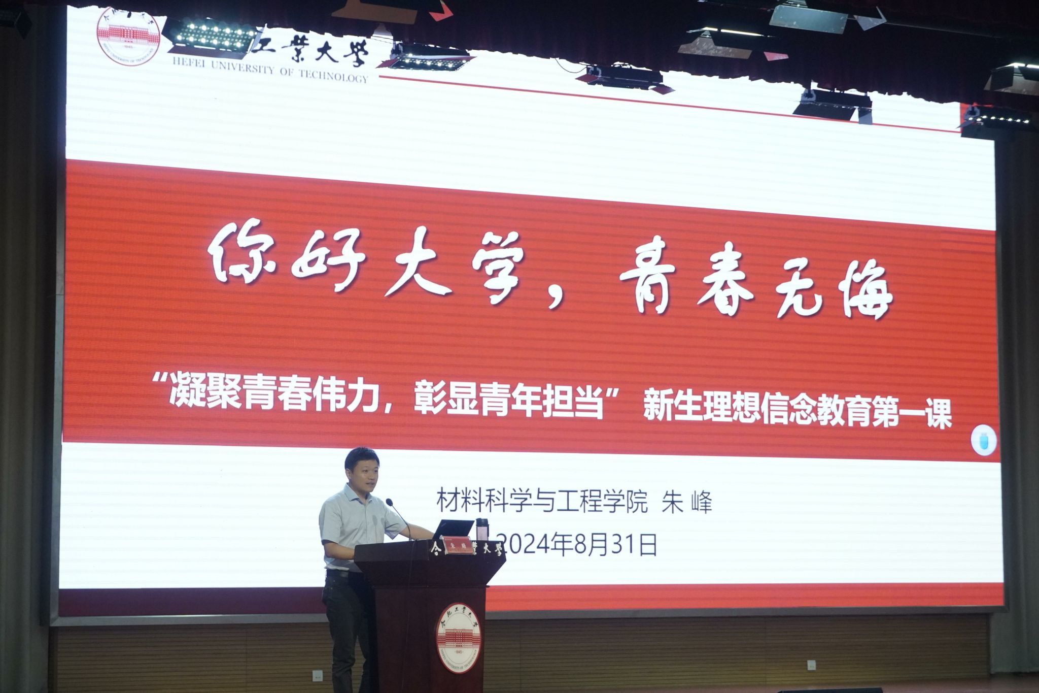 本次活动由学院党委副书记、纪委书记朱峰主讲。他以“你好大学,青春无悔”为题,围绕学习贯彻党的二十届三中全会精神和学习贯彻合肥工业大学第九次党代会精神,从校史校情、学院文化、学生工作三个层面,为同学们讲述了如何在大学生活中将小我融入大我,将青春献给祖国。他强调,学校建校近80年来,始终秉承“工业报国”的使命担当,围绕“培养德才兼备、能力卓越、自觉服务国家的骨干与领军人才”的人才培养总目标,形成了“千人一领军”的创新人才培养品牌。他从党建思政、师资力量、科研平台、人才培养和科学研究等方面介绍了学院“锻造一流材料,培育一流人才”的学院文化。他希望全体新生能牢记习近平总书记对青年学子殷切寄语,把专业学习作为未来人生奋斗的方向,勇攀科学高峰,争做有理想、敢担当、能吃苦、肯奋斗的新时代工大青年。最后,他寄语青年学子,希望同学们一是要坚定理想信念,怀揣工业报国理想;二是要尽快转变角色,适应大学生活学习;三是要找准目标方向,做好学业和职业规划。