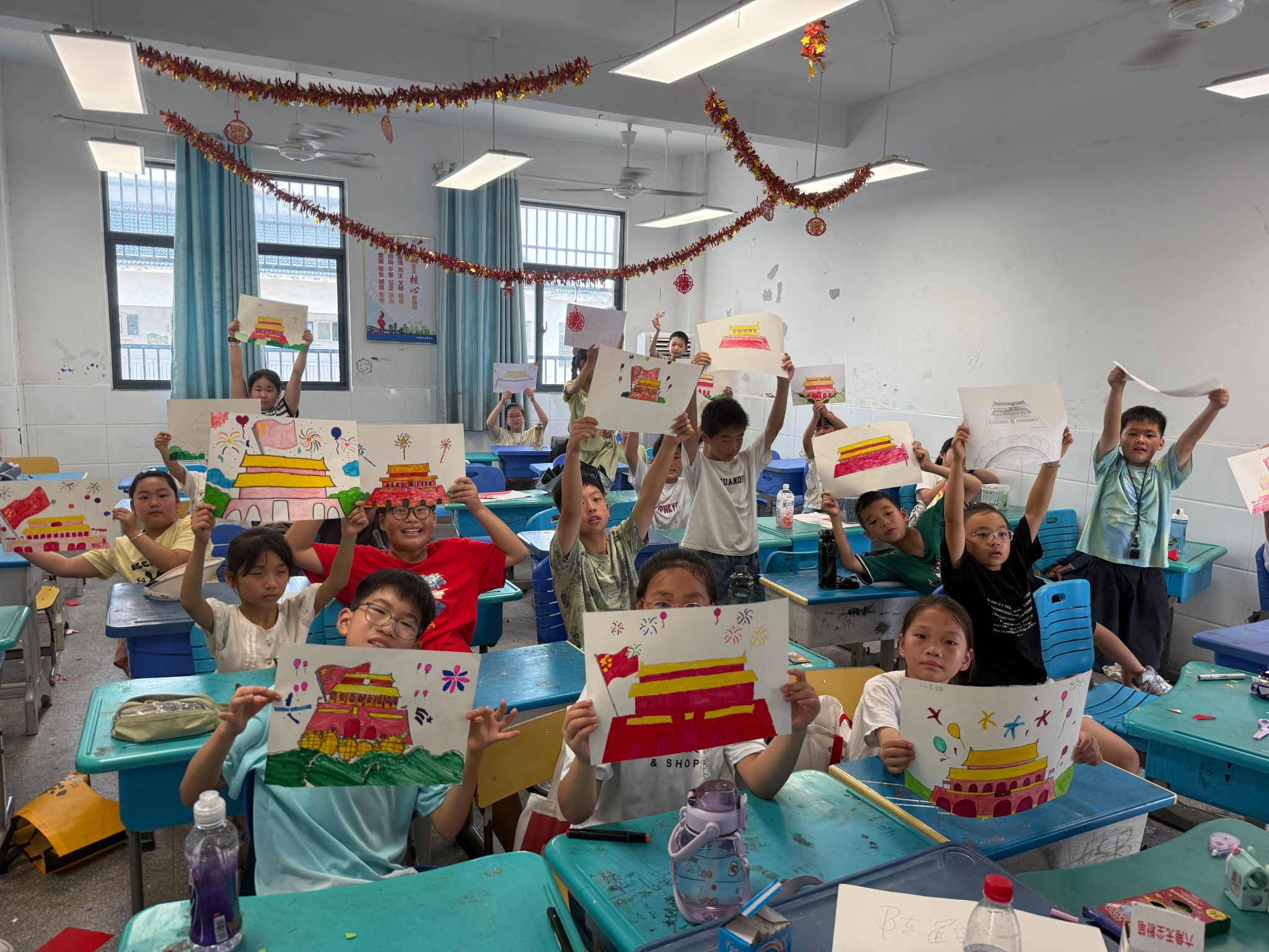 课程之余,团队精心策划的“趣味运动会”点燃了校园热情。两人三足、丢手绢、你画我猜等项目中,孩子们奋勇争先,欢呼声、加油声此起彼伏。活动尾声的“童心向党”绘画展示环节,孩子们用五彩画笔描绘天安门、国旗,稚嫩笔触间满是对祖国的热爱。
